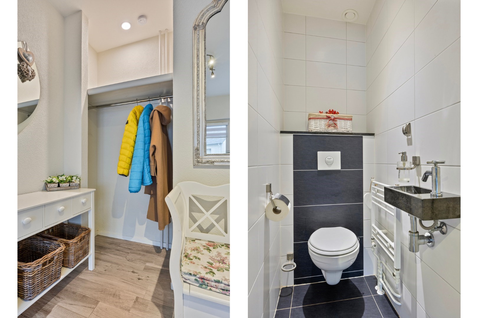 1e verdieping(v.v. laminaatvloer: overloop met luxe 3e toilet(‘19), 4 ruime slaapkamers ca 14m² met airco, 10m², 10m² met dakkapel en 6m2 met ingebouwde bergruimte, luxe complete en ruime 2e badkamer(’19) met dakkapel en rolluik, luxe breed badmeubel met 2 waskommen en ruime inloopdouche.