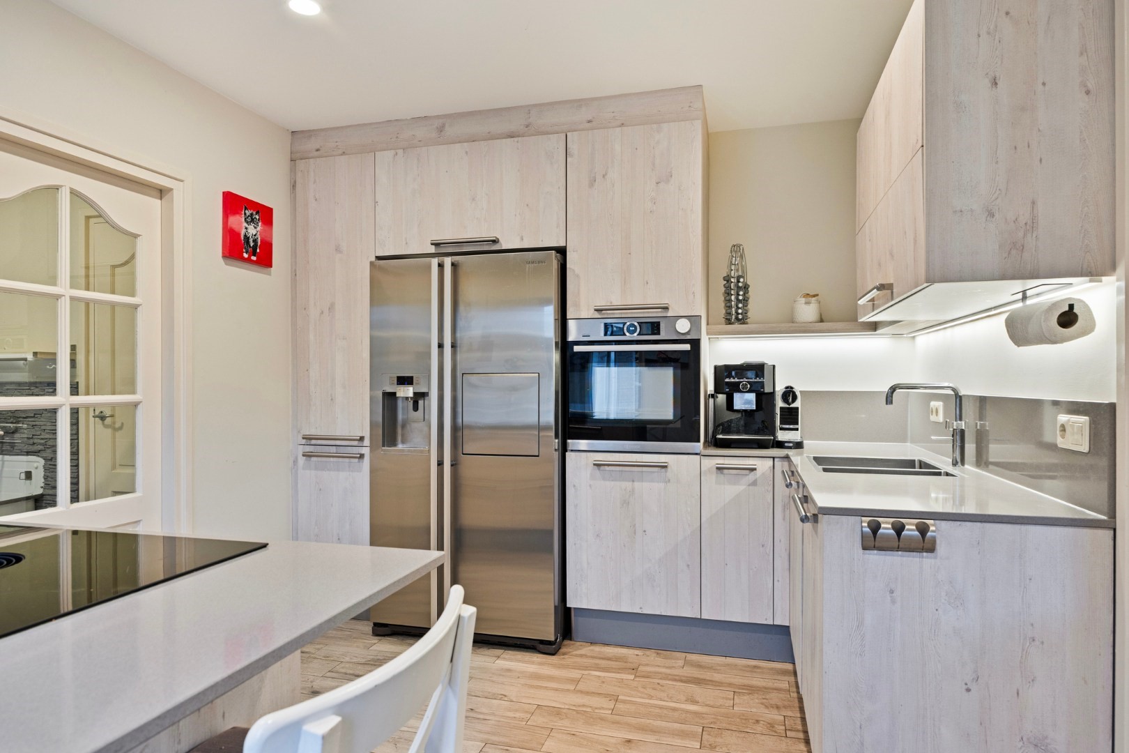 Eetkeuken ca 12m² met luxe keukeninrichting(’21) voorzien van kookeiland met Bora inductie-kookplaat met ingebouwde afzuiging en eetbar, royale hoekkeuken met dubbele spoelbak, Quoocker, combi-magnetronoven, vaatwasser, Amerikaanse koel/vrieskast (met ijsblokjes automaat) en composiet werkblad. Woonkamer en keuken tezamen ca 52m2 met nieuwe tegelvloer en vloerverwarming