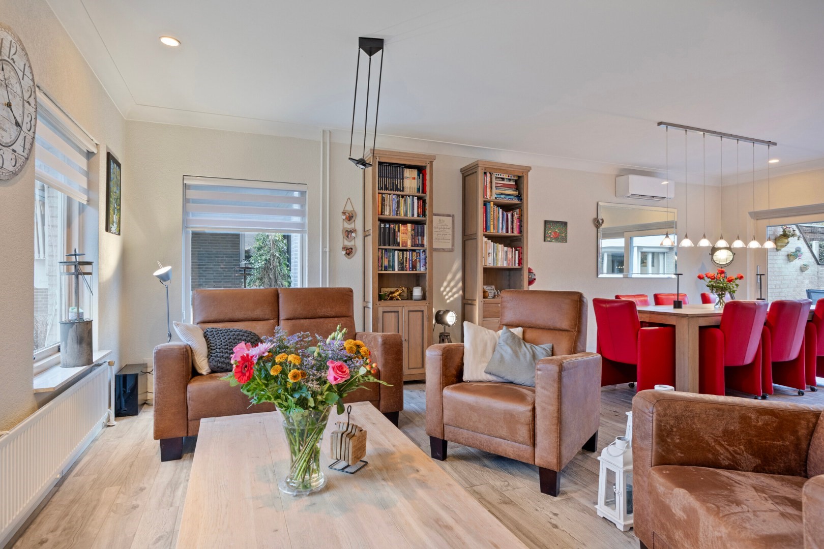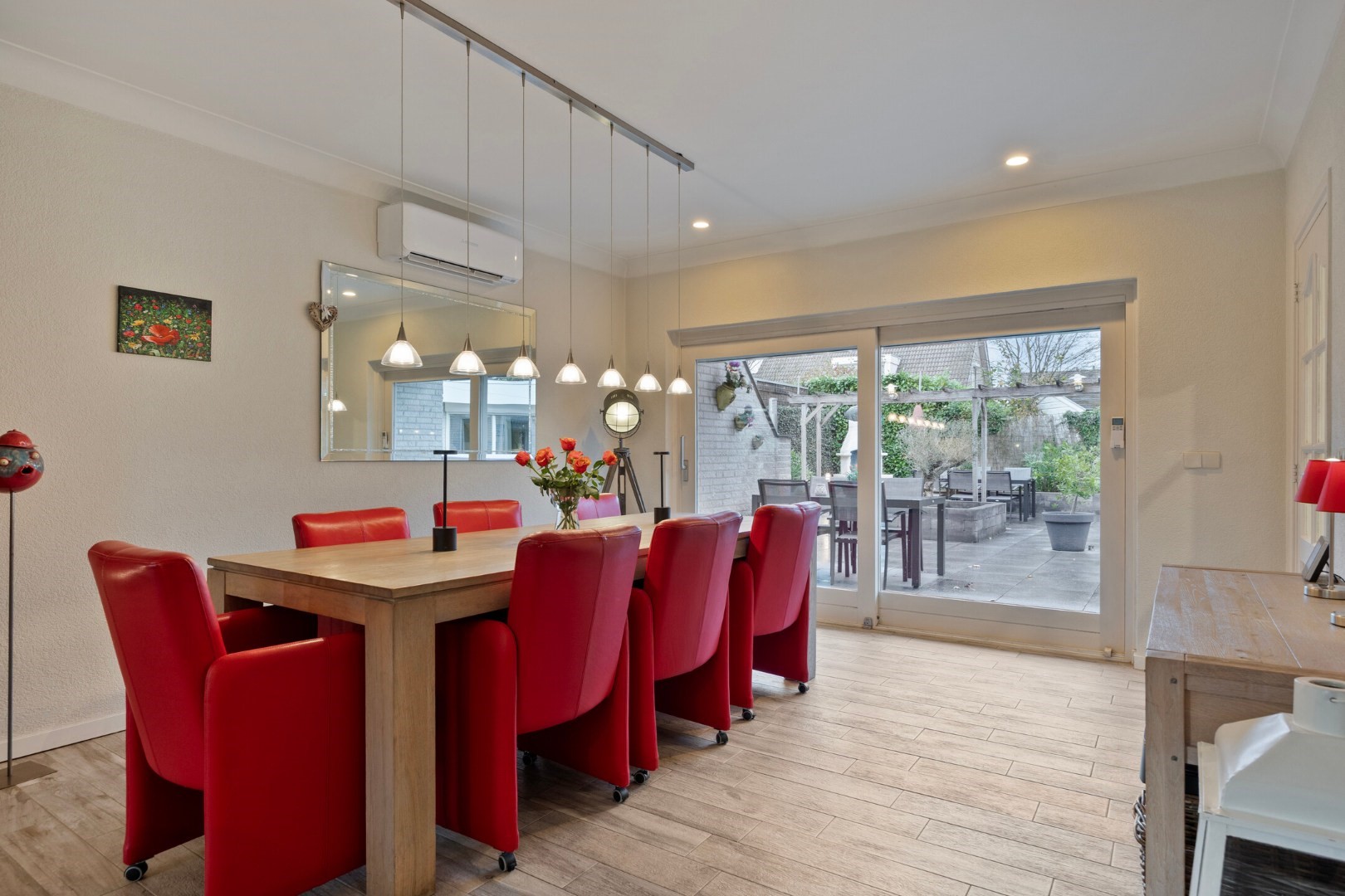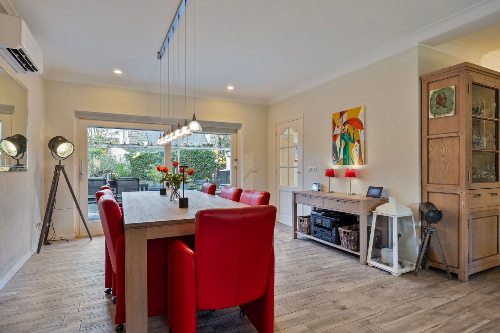 Indeling: zeer ruime hal ca 11m² met luxe toilet(’19), garderobe en vernieuwde meterkast(8 groepen), deur naar woonkamer. Ruime L-vormige lichte woonkamer ca 40m² verdeeld in royale zitgedeelte voorzijde en eetgedeelte/kamer met airco aan de achterzijde met schuifpui en fraai zicht op zonnige achtertuin en zijtuin.