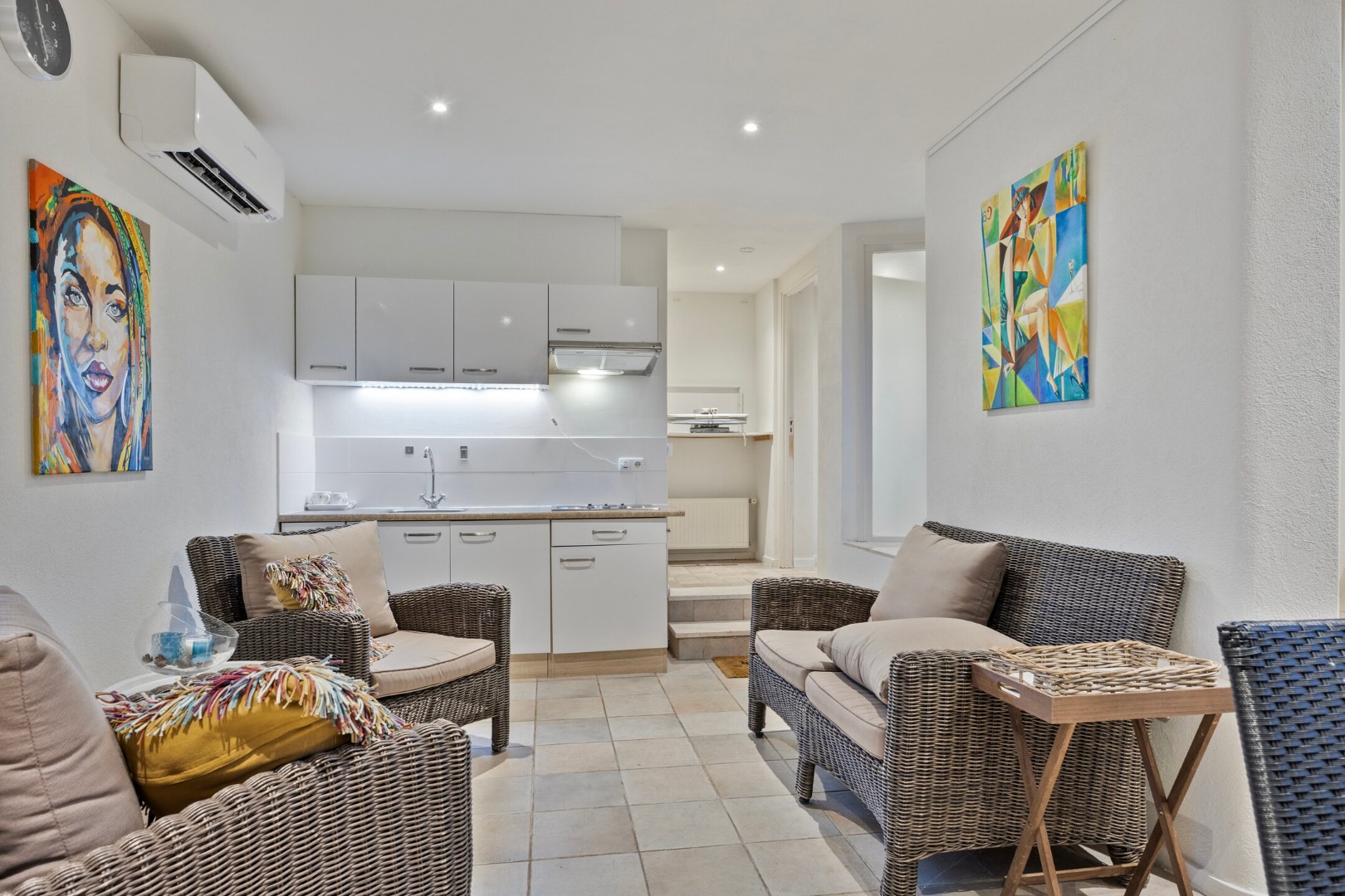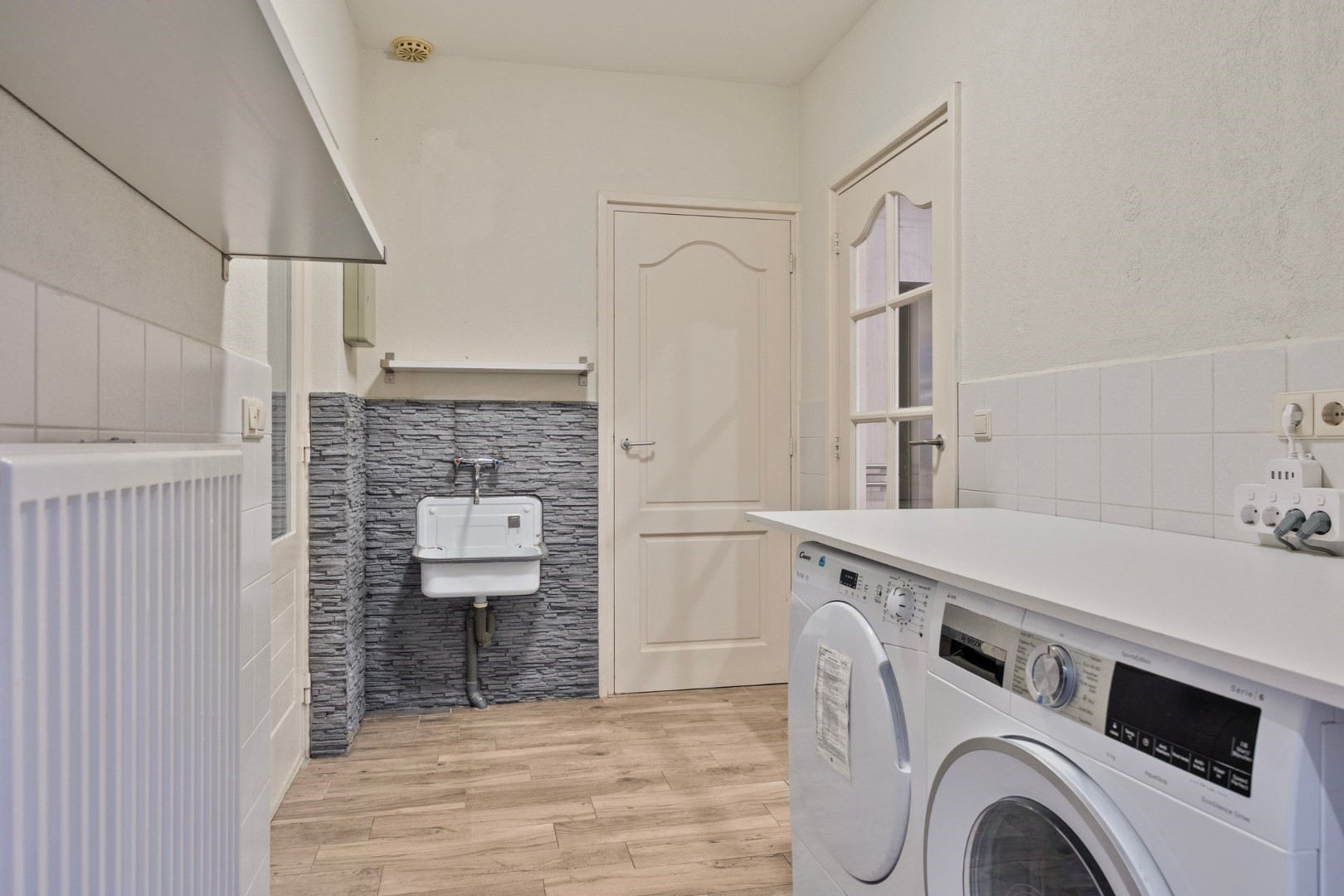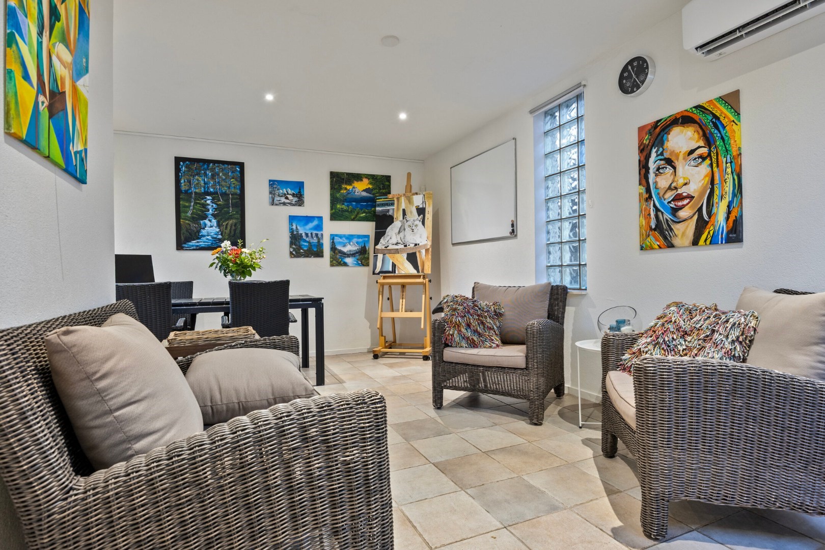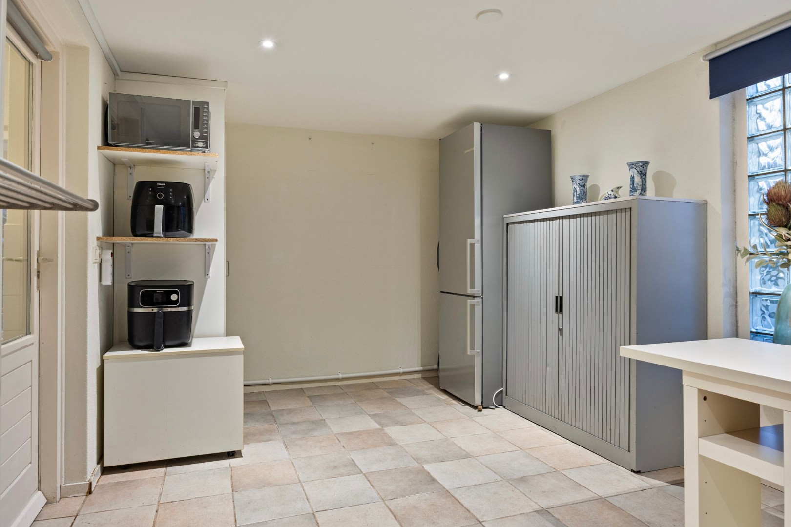 Deur naar ruime bijkeuken/2e hal met bergkast, aansluiting wasapparatuur, deur naar hal, tuindeur en deur naar ruime 2e woonruimte/mantelzorg/hobby/werkruimte annex slaapkamer ca 22m² met keukenblok, airco, eigen complete badkamer met aparte douche(’24), 2e toilet en vaste wastafel.