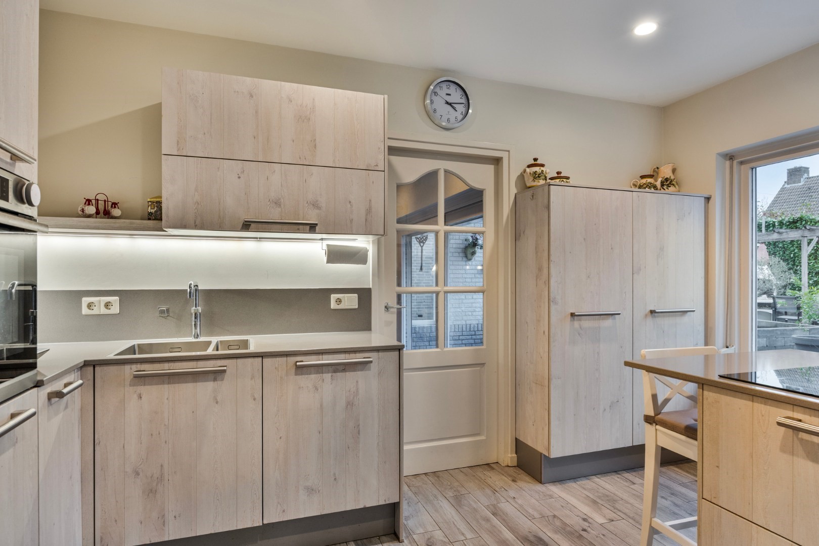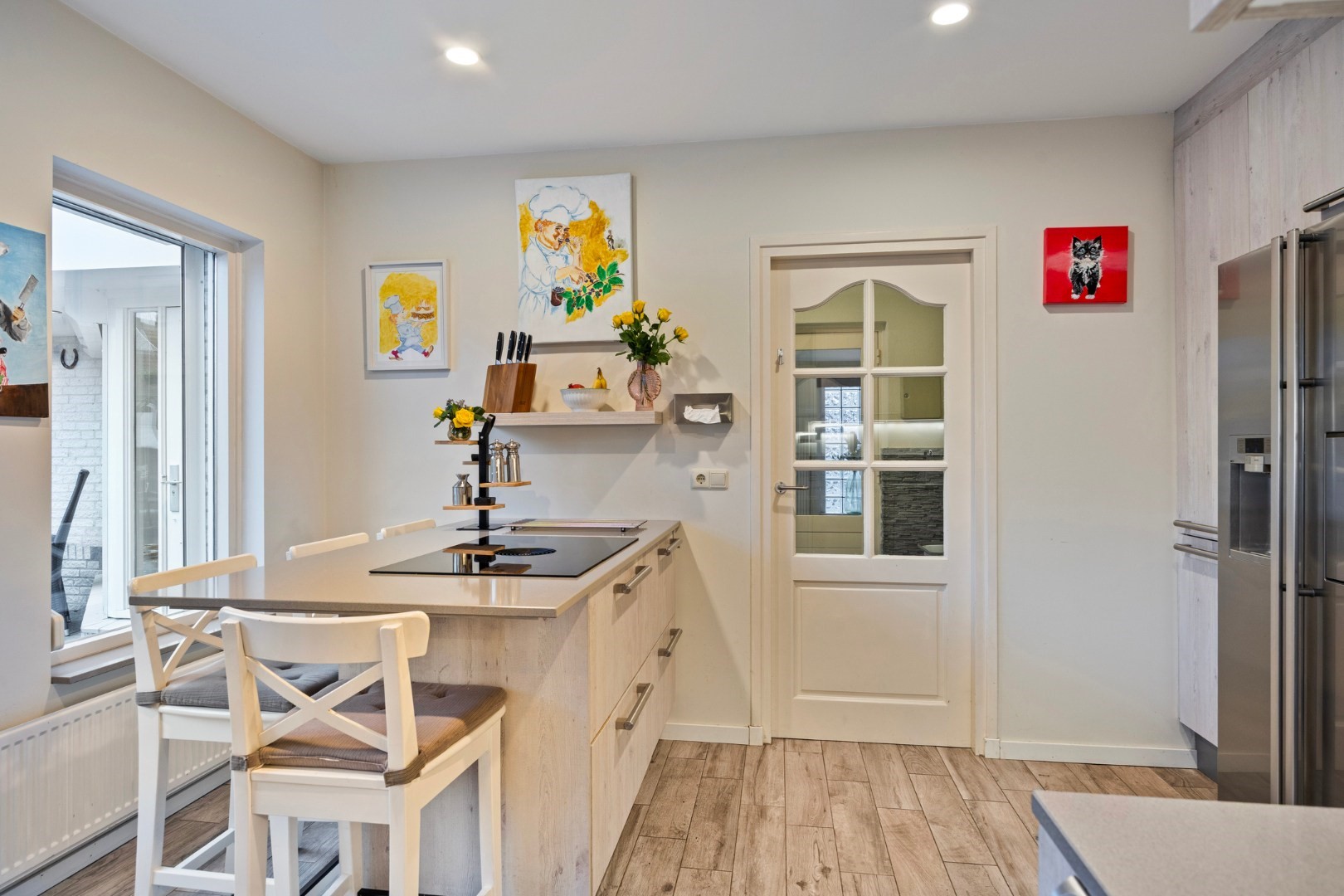 Eetkeuken ca 12m² met luxe keukeninrichting(’21) voorzien van kookeiland met Bora inductie-kookplaat met ingebouwde afzuiging en eetbar, royale hoekkeuken met dubbele spoelbak, Quoocker, combi-magnetronoven, vaatwasser, Amerikaanse koel/vrieskast (met ijsblokjes automaat) en composiet werkblad. Woonkamer en keuken tezamen ca 52m2 met nieuwe tegelvloer en vloerverwarming