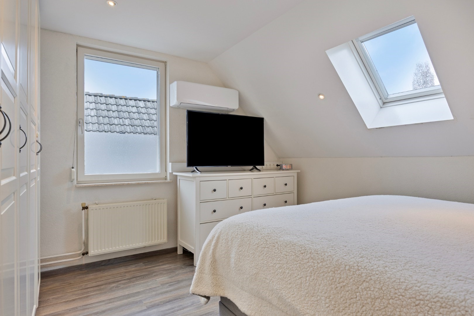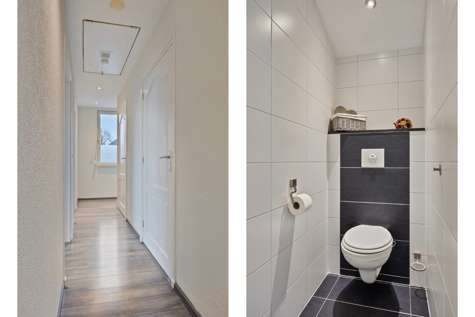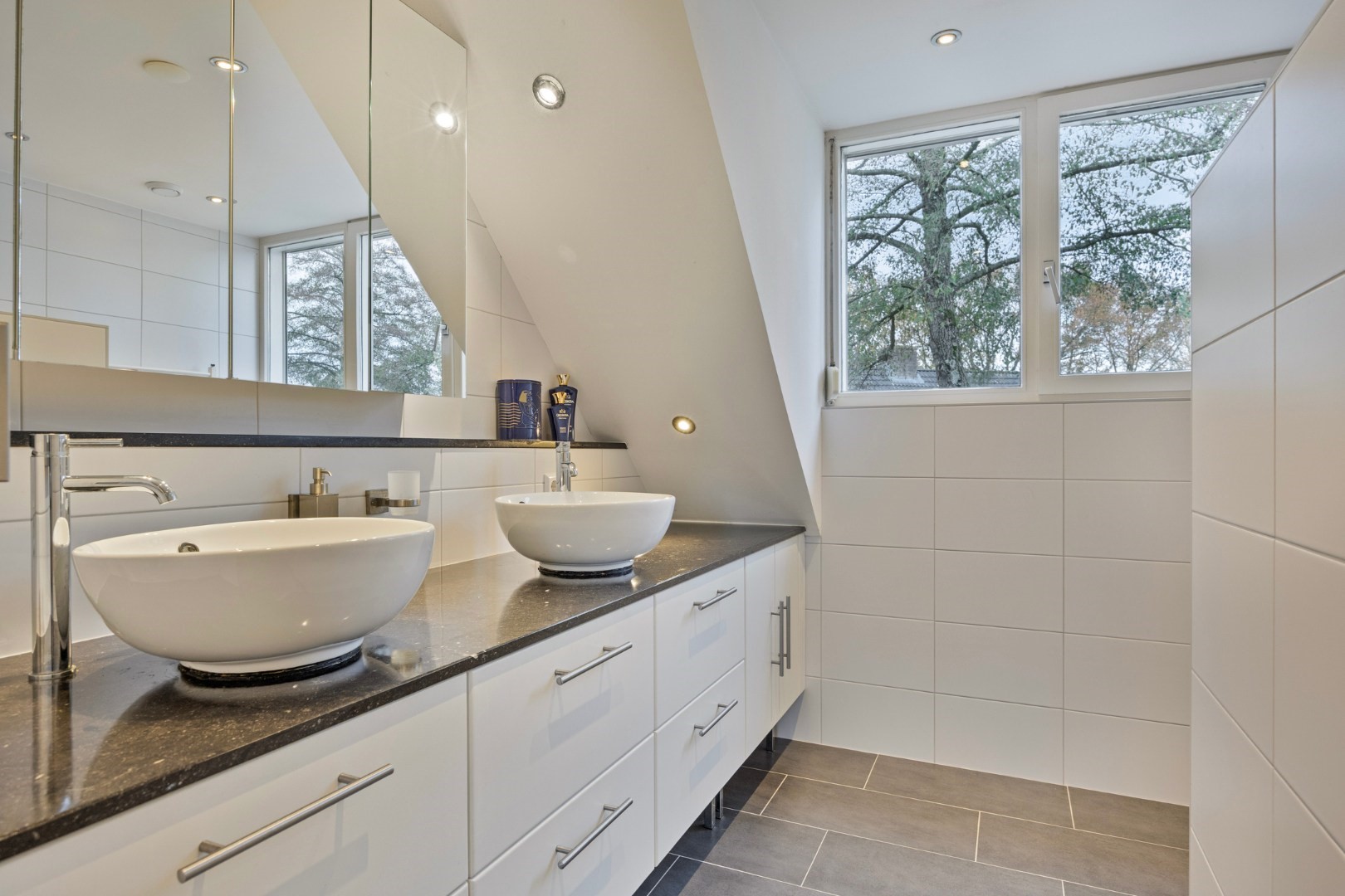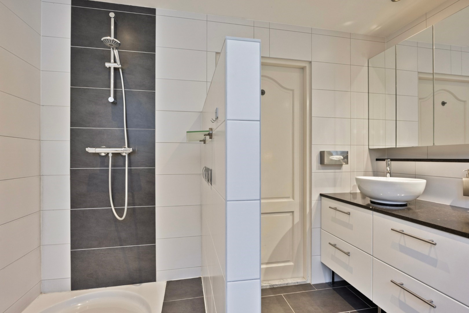 1e verdieping(v.v. laminaatvloer: overloop met luxe 3e toilet(‘19), 4 ruime slaapkamers ca 14m² met airco, 10m², 10m² met dakkapel en 6m2 met ingebouwde bergruimte, luxe complete en ruime 2e badkamer(’19) met dakkapel en rolluik, luxe breed badmeubel met 2 waskommen en ruime inloopdouche.