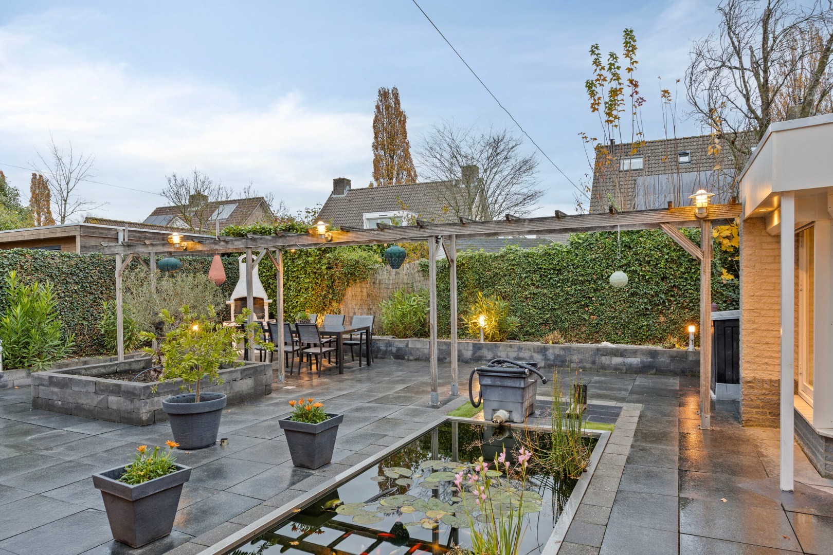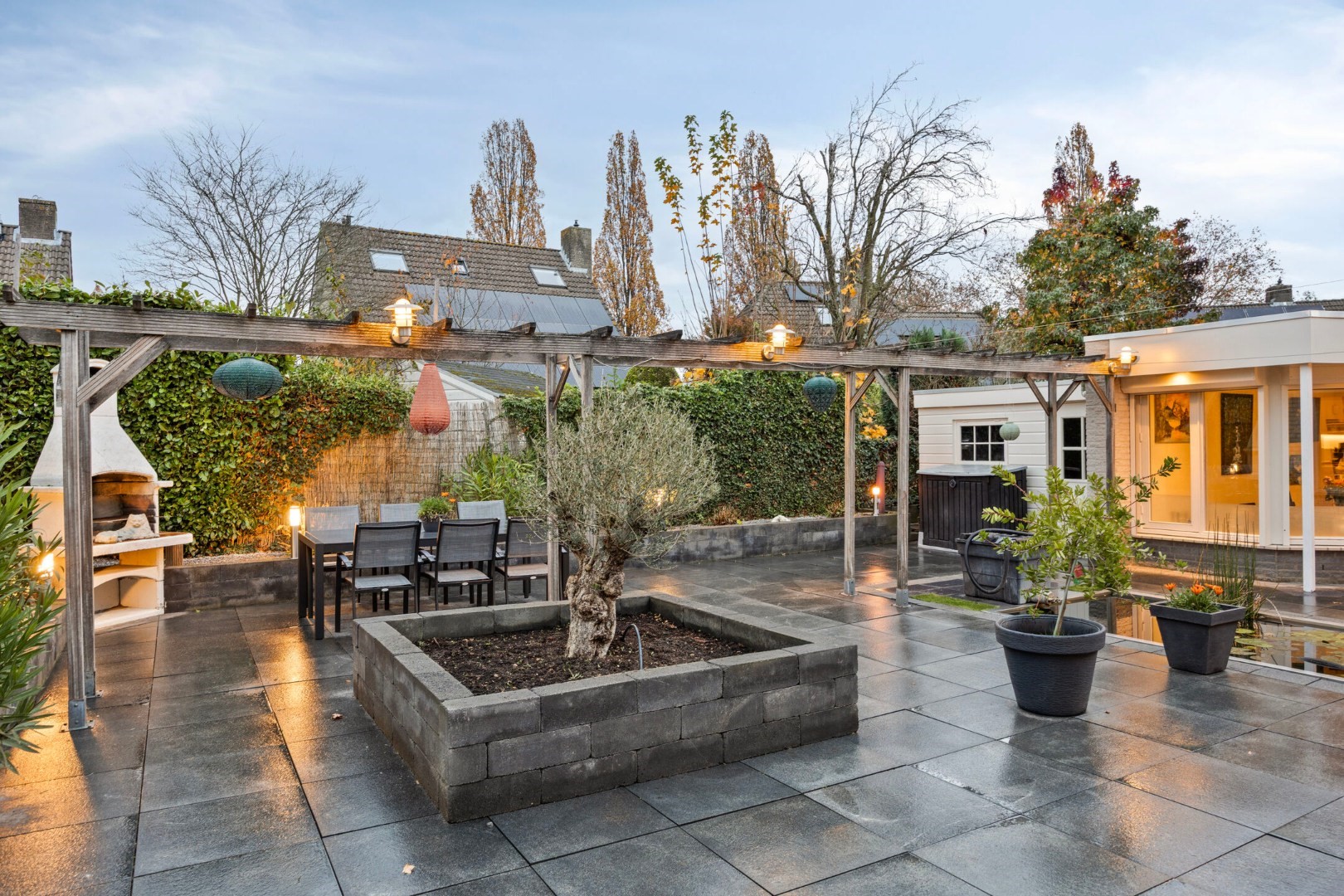 Mooi aangelegde ca 12m diepe en ca 11m brede achter– en zijtuin met groot terras, sproei-installatie, royale berging ca 14m² en dubbele achterom.