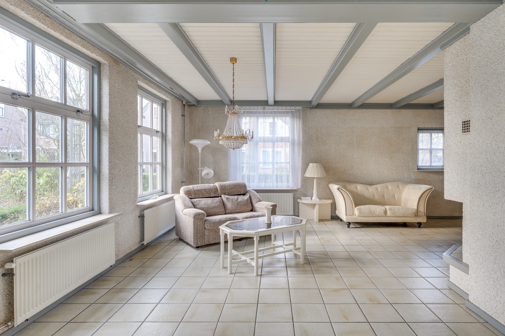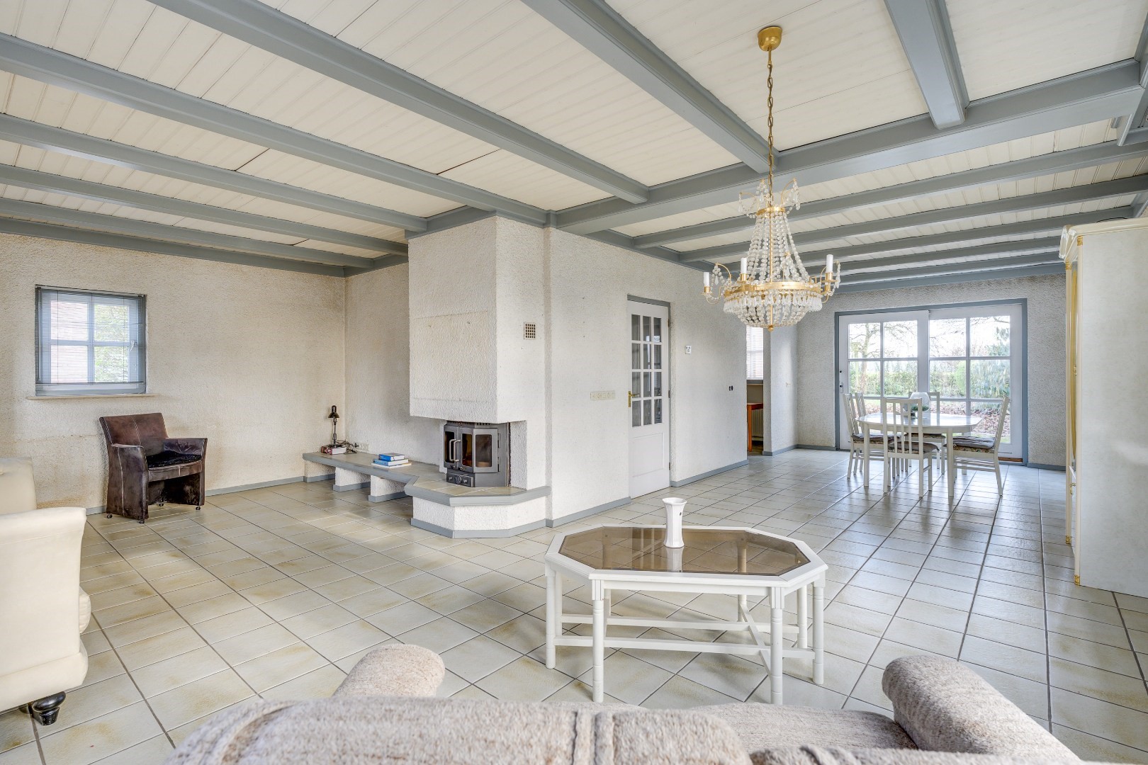 Ruime lichte L-woonkamer ca 50m² met open haard, grote ramen (met mooie roedeverdeling), royaal eetgedeelte met grote schuifpui naar achtertuin en doorgang naar keuken.