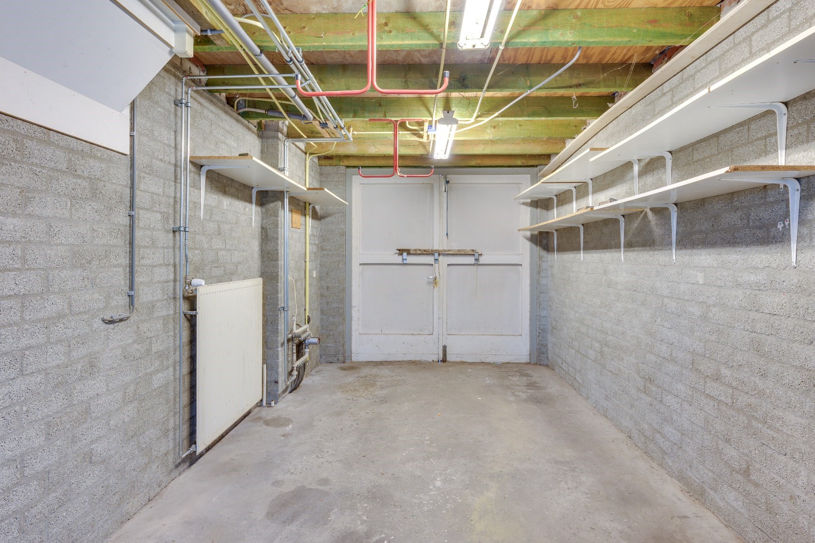 Deur naar ruime bijkeuken/portaal ca 7m2 met Nefit HR-cv-combiketel(‘13), aansluiting wasapparatuur, tuindeur, trap naar op verdieping boven garage gelegen werk/slaap-/speelkamer ca 17m2 en deur naar garage ca 18m² met dubbele garagedeuren. Vanuit garage deur naar aangebouwde tuinkamer/serre ca 15m² met dubbele tuindeuren naar royale achtertuin met uniek vrij uitzicht over landerijen.