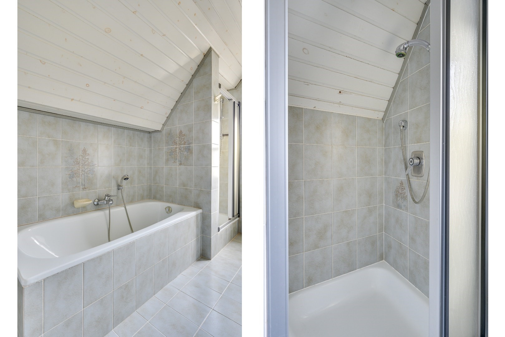 Complete geheel betegelde badkamer met ligbad, aparte douche, 2 wastafels, 2e toilet en raam met uniek vrij uitzicht.