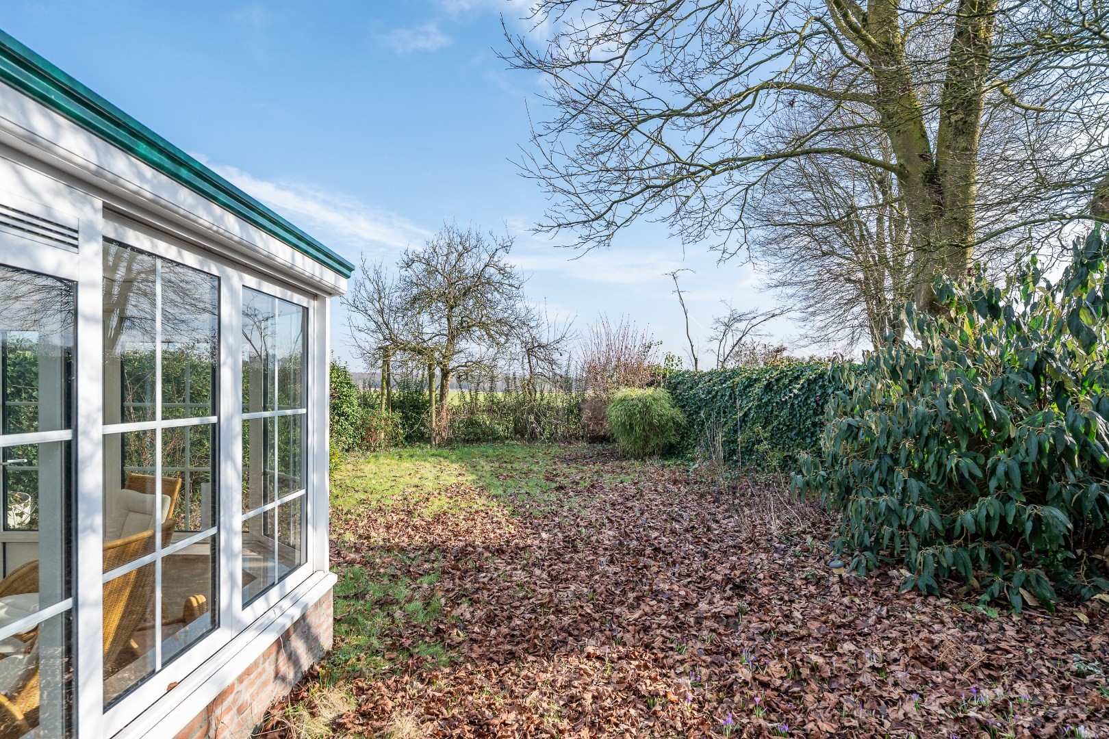 Zonnige geheel vrij gelegen ca 23m diepe achtertuin met royaal overdekt terras ca 14m2 en heerlijk uniek uitzicht over landerijen en beschermd natuurgebied.