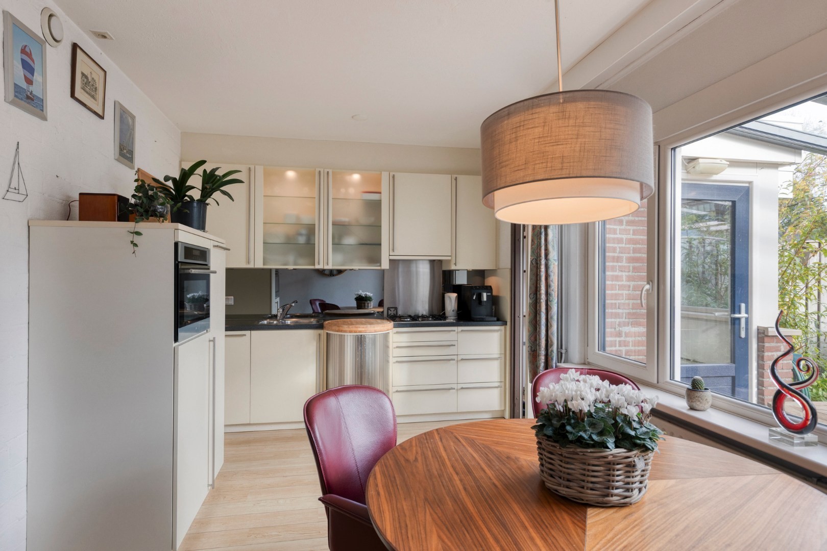 Indeling: hal met kunststof voordeur('16), garderobe en meterkast, deur naar royale L-vormige woonkamer verdeeld in zitgedeelte aan de voorzijde en eetgedeelte aan tuinzijde voorzien van laminaatvloer, open keuken met luxe keukeninrichting(’04) met 4 pits gaskookplaat, combi-magnetron, vaatwasser en koelkast en praktische bergkast. Bijkeuken met aansluiting wasapparatuur en kunststof tuindeur. Tussenportaal met luxe royaal toilet(‘06). Totale living ca 40m² met laminaatvloer.