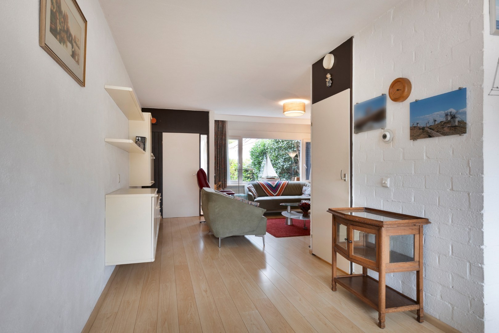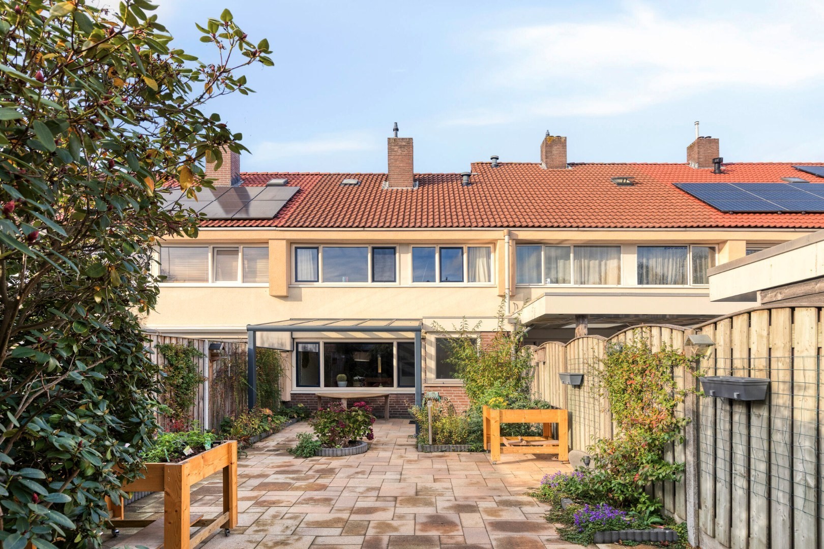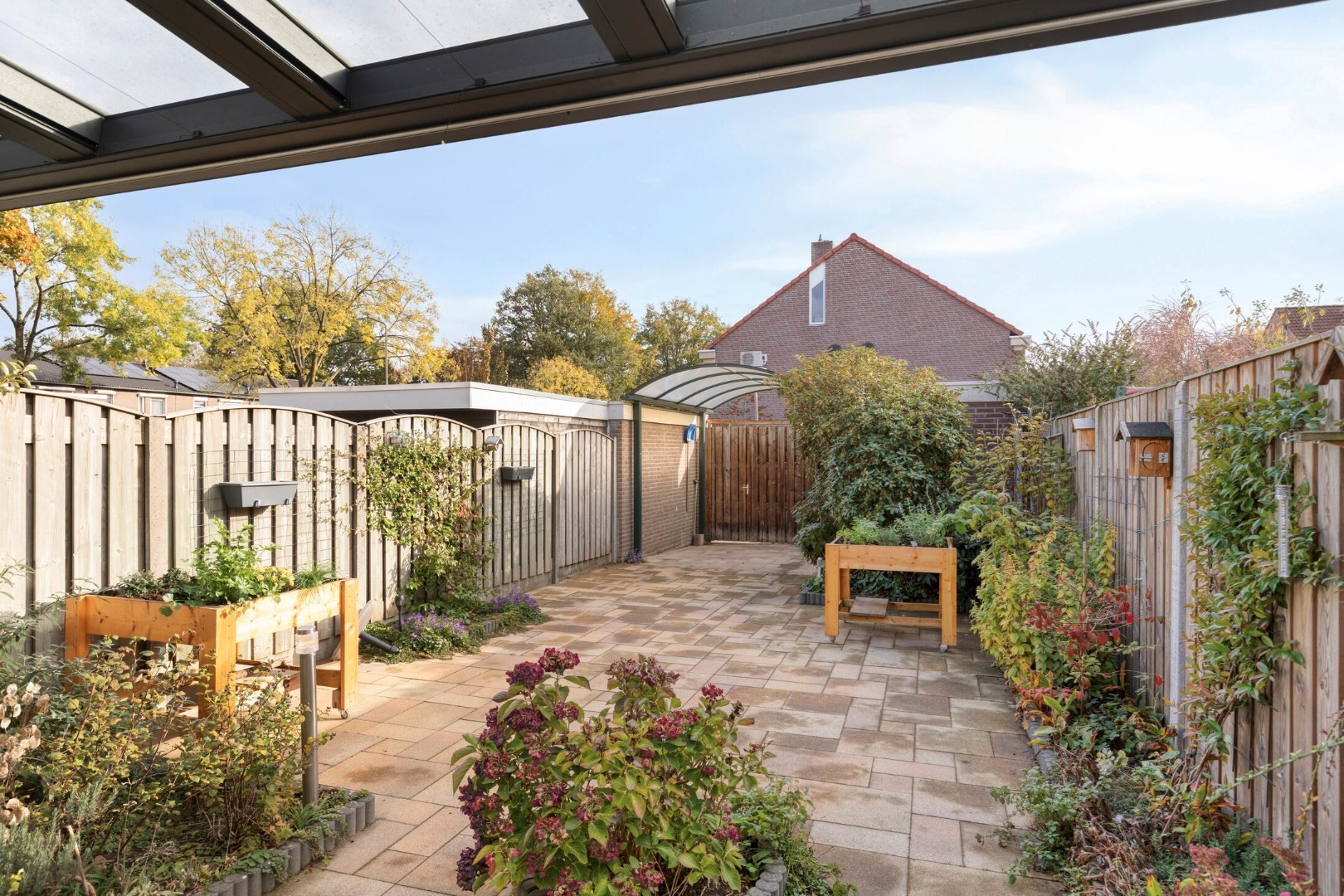 Vanuit bijkeuken/portaal deur naar naar royaal overdekt terras ca 10m2 en zonnige ca 16m diepe fraai aangelegde achtertuin met ruime berging, lichte carport en brede achterom.
