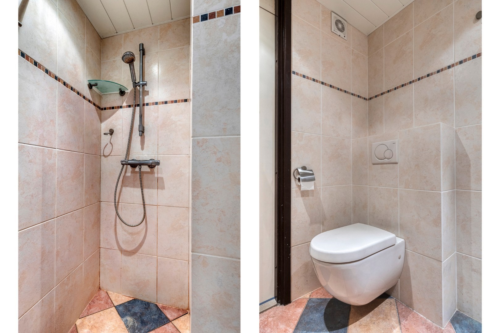 First floor: landing, central heating cupboard with an Intergas HR combi boiler (2020), three spacious bedrooms of approximately 15, 12, and 9m², respectively, and a renovated luxury bathroom (2004) with a walk-in shower, second toilet, washing machine connection, and a spacious vanity with a sink and wall cabinet.