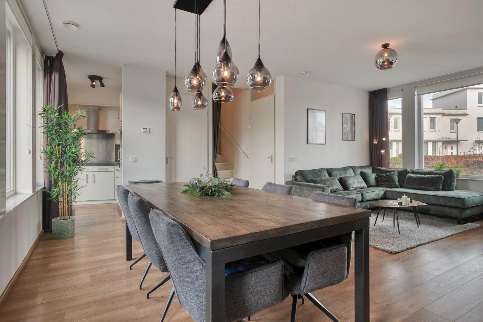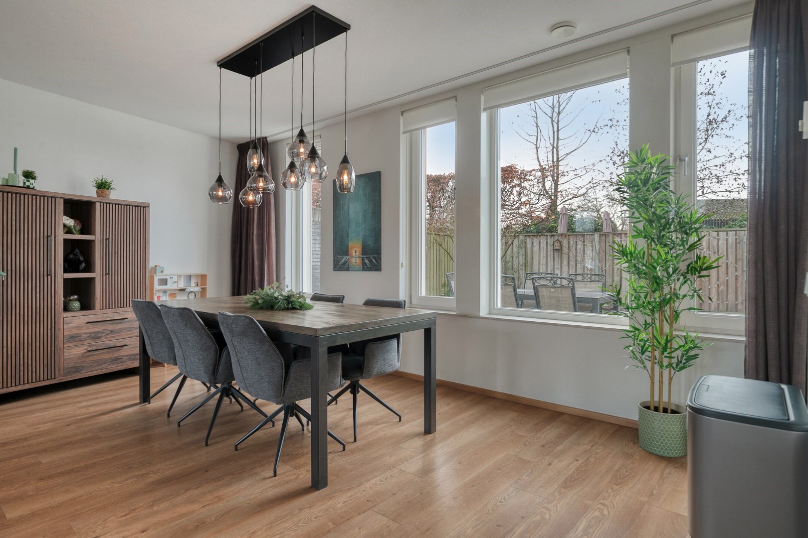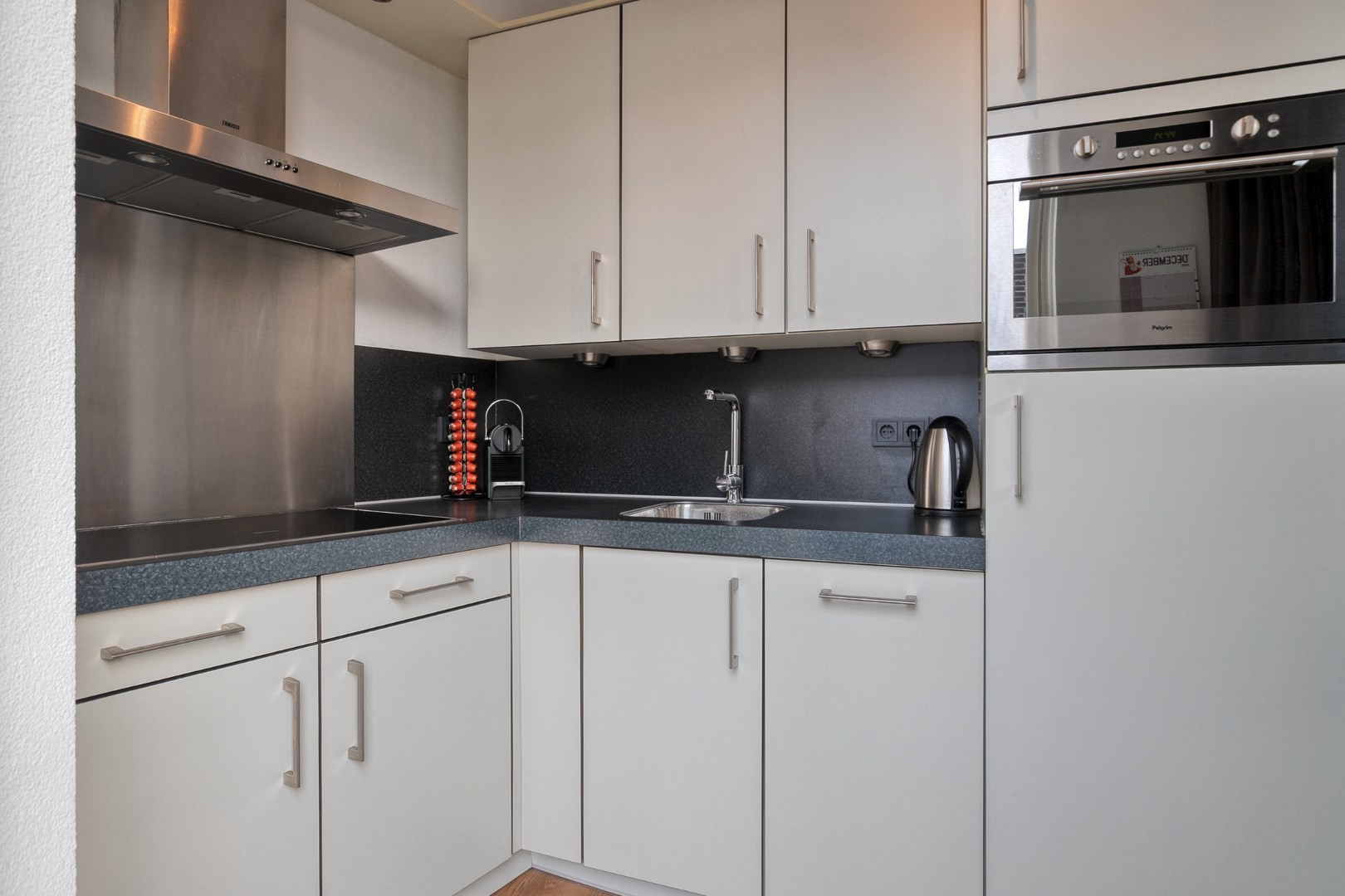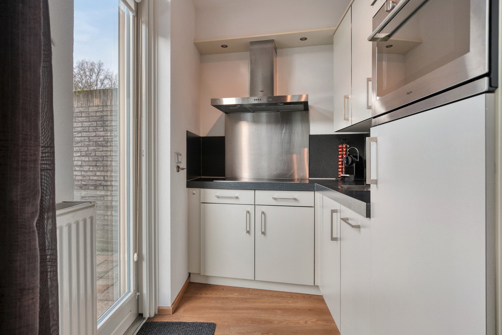 Gedeeltelijk open keuken met luxe inrichting v.v. kookplaat, vaatwasser, koelkast, combi-oven, afzuigkap en tuindeur.