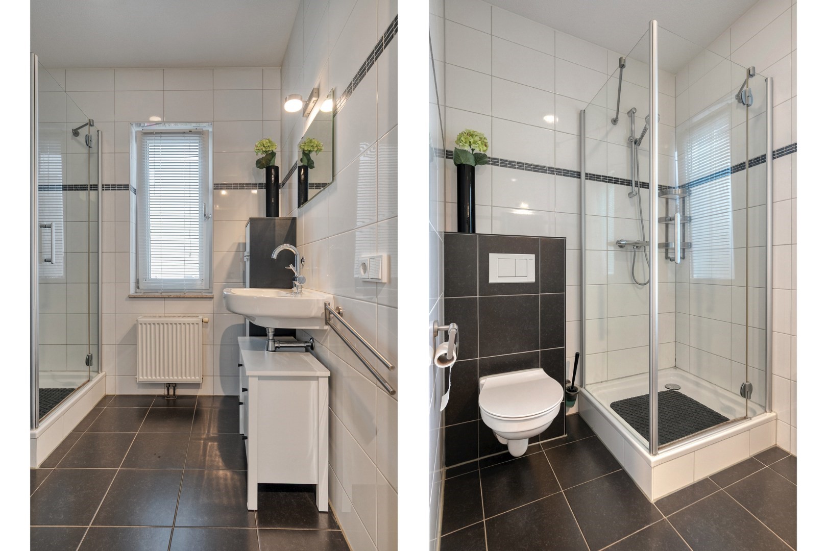Ruime luxe badkamer met douchecabine, wastafel en 2e toilet.