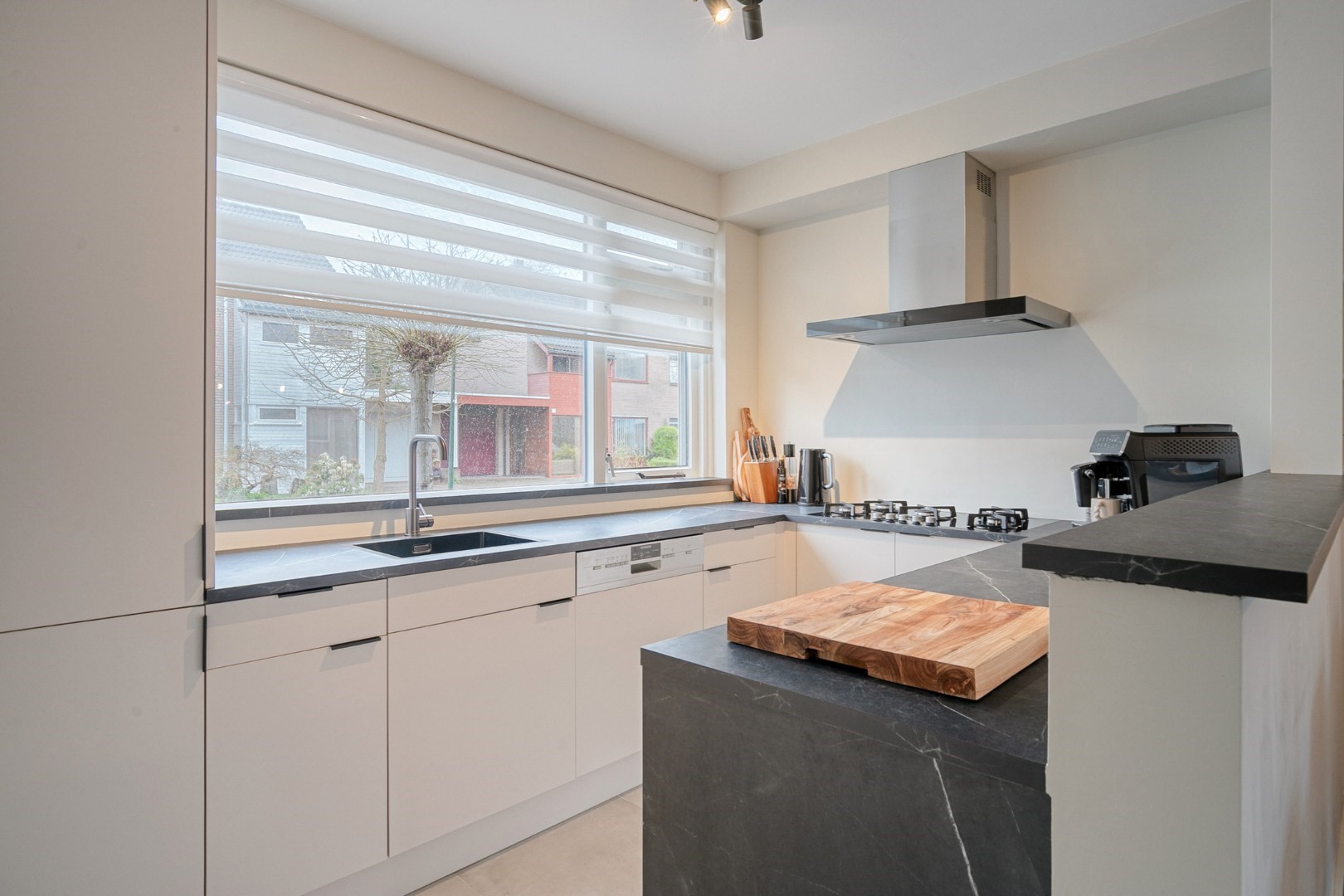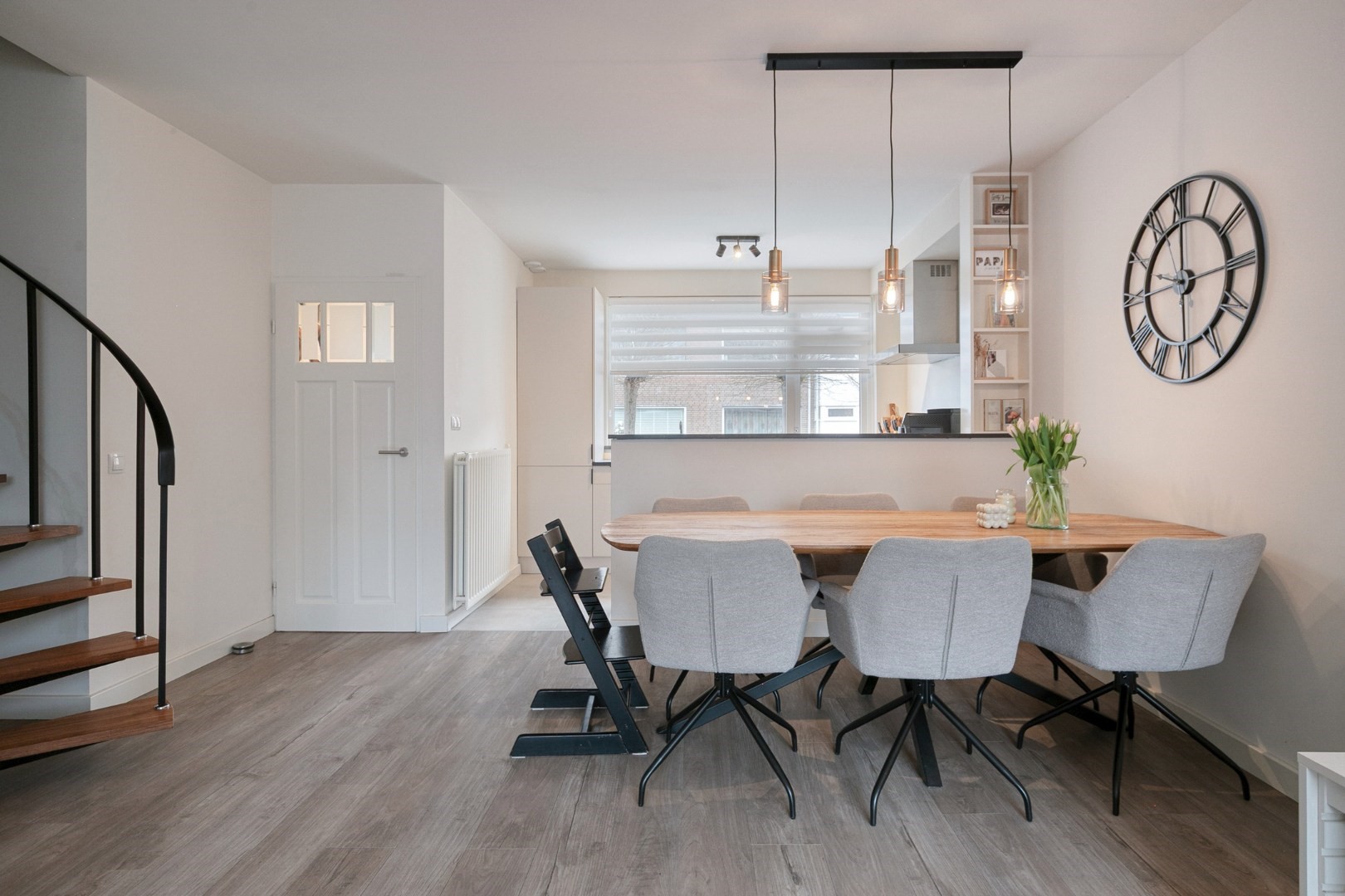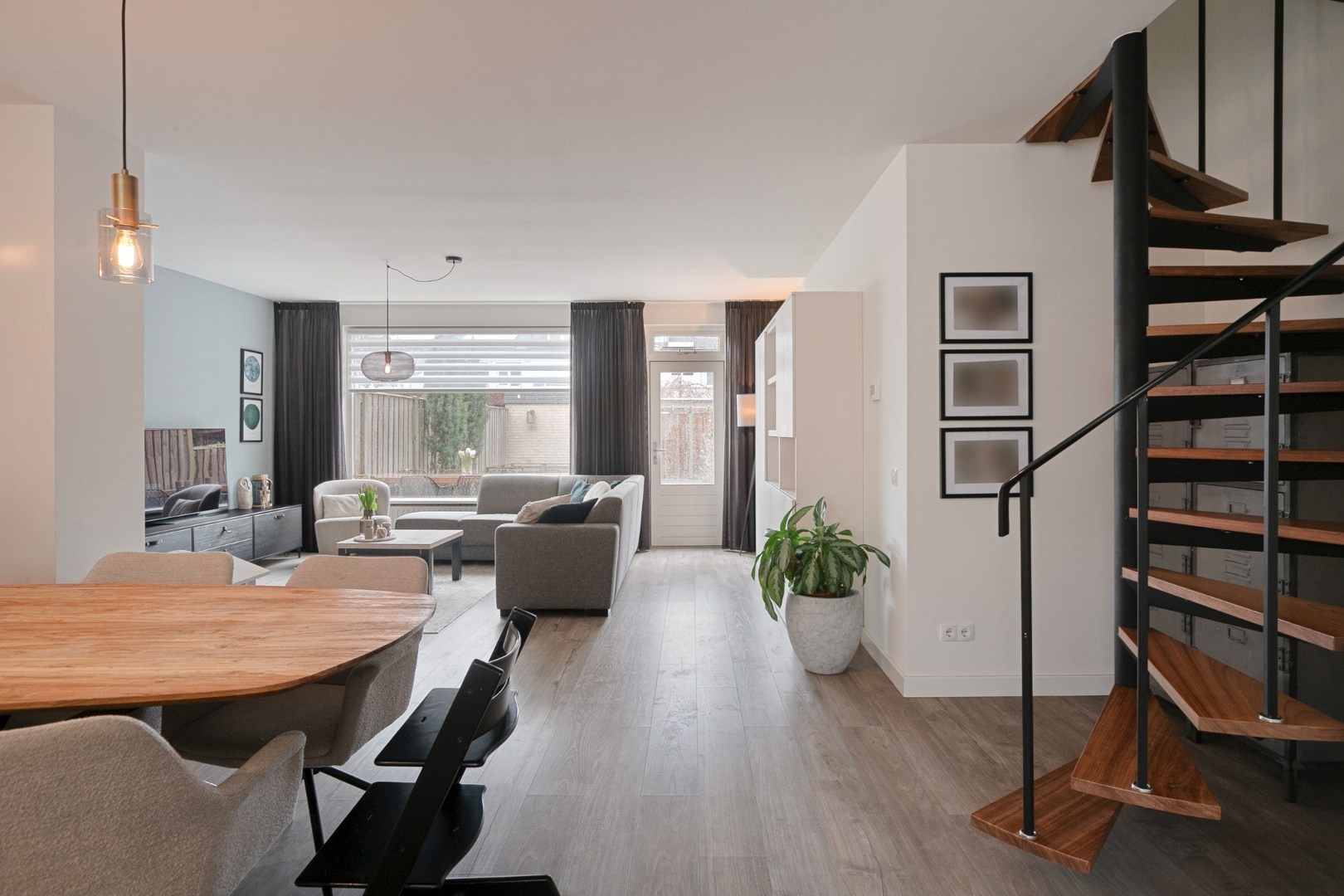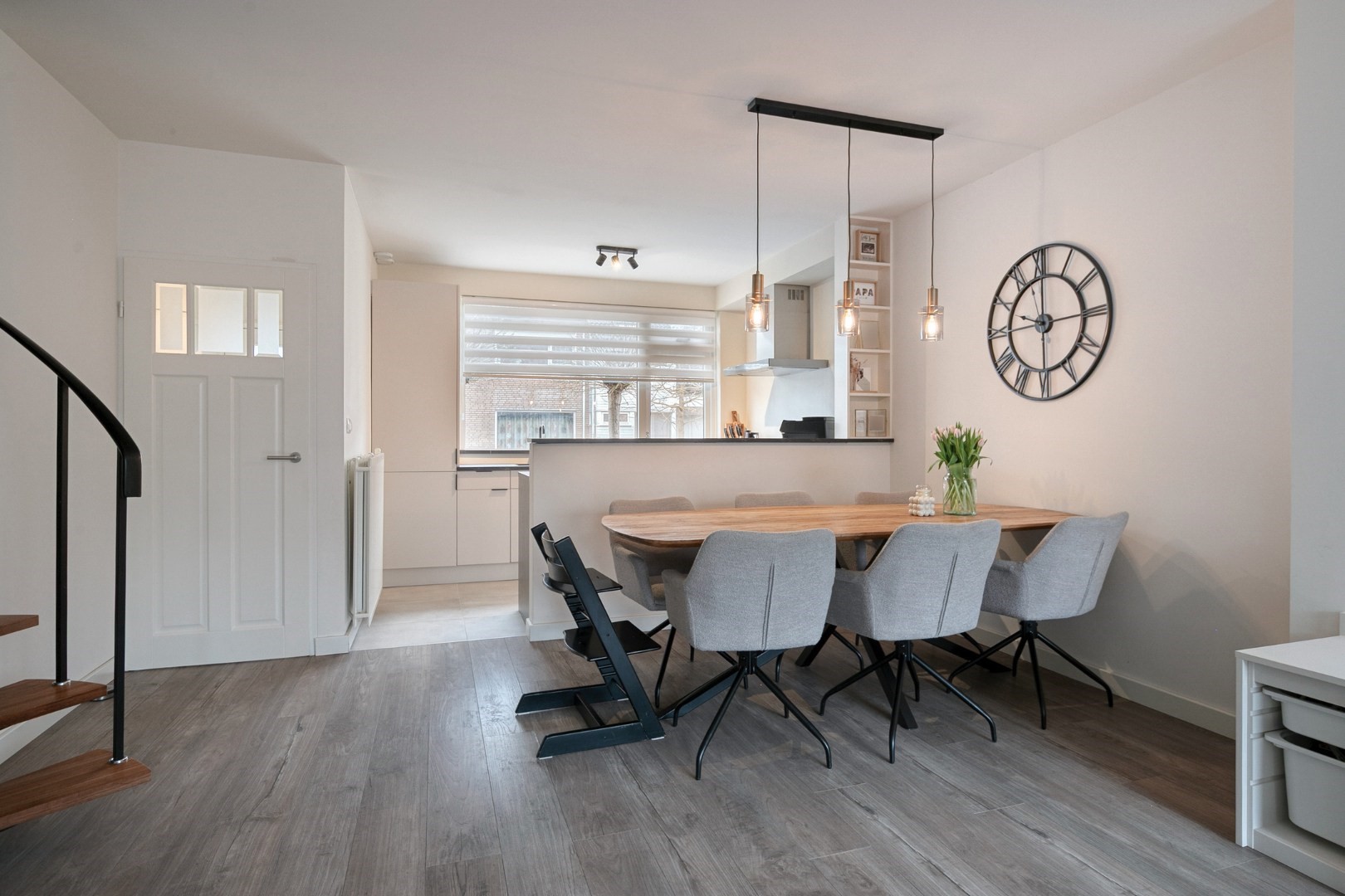 Layout: spacious hall with new luxury front door, meter cupboard, and luxury toilet ('25), luxury door to a spacious Z-shaped living room of approx. 38m² with a garden door, spacious open kitchen with luxury kitchen fittings modernized in 2024 featuring an HPL worktop, hob with extractor hood, combination oven, dishwasher, refrigerator, freezer, large window, and plenty of cupboard space. Total living area approx. 45m² fitted with laminate flooring and stairs to the upper floor.