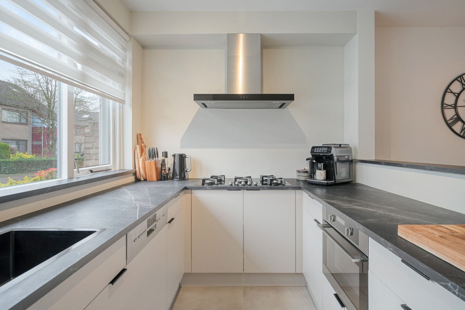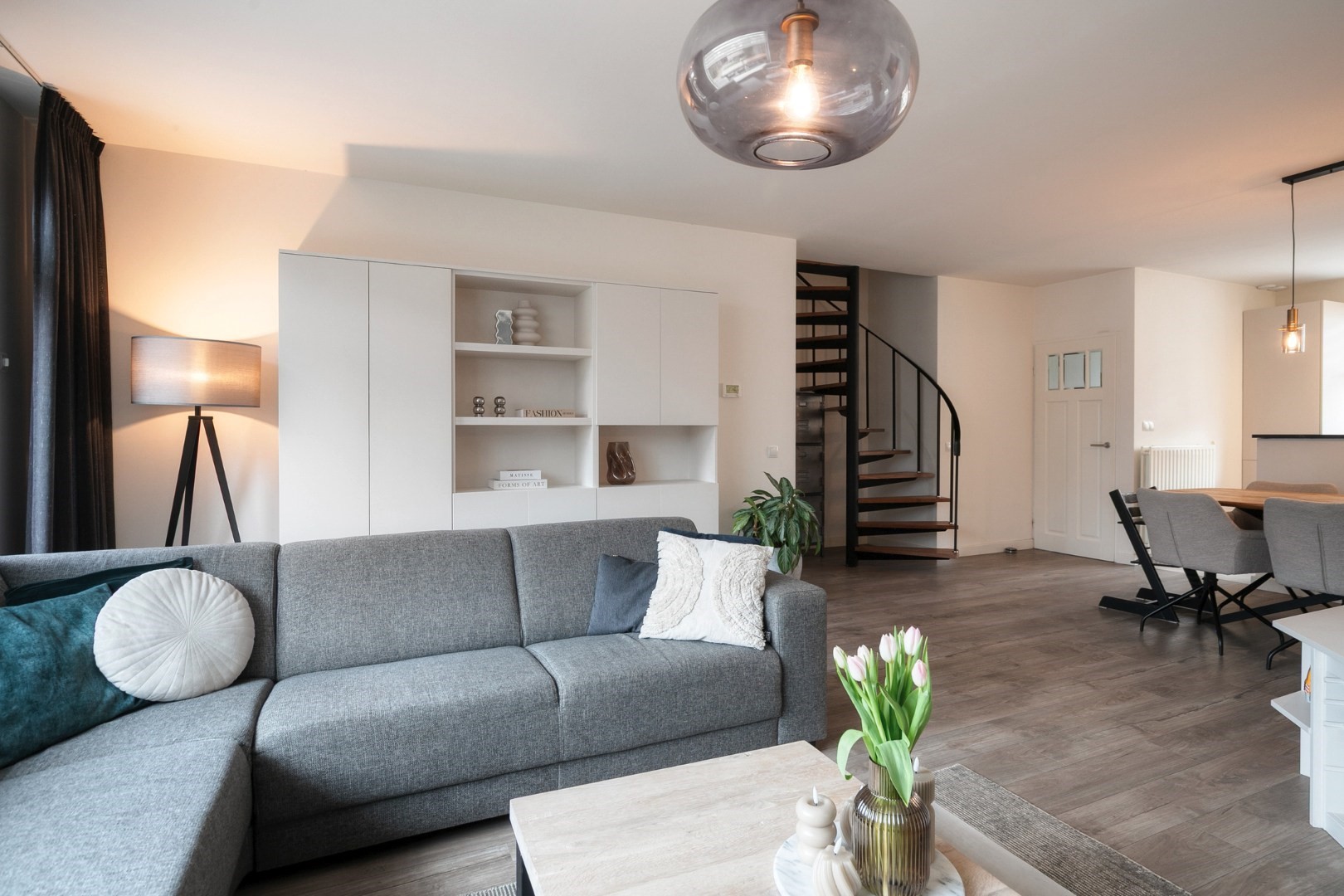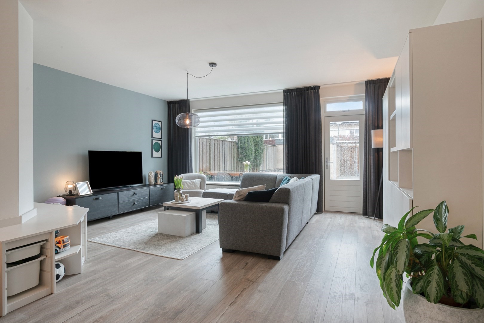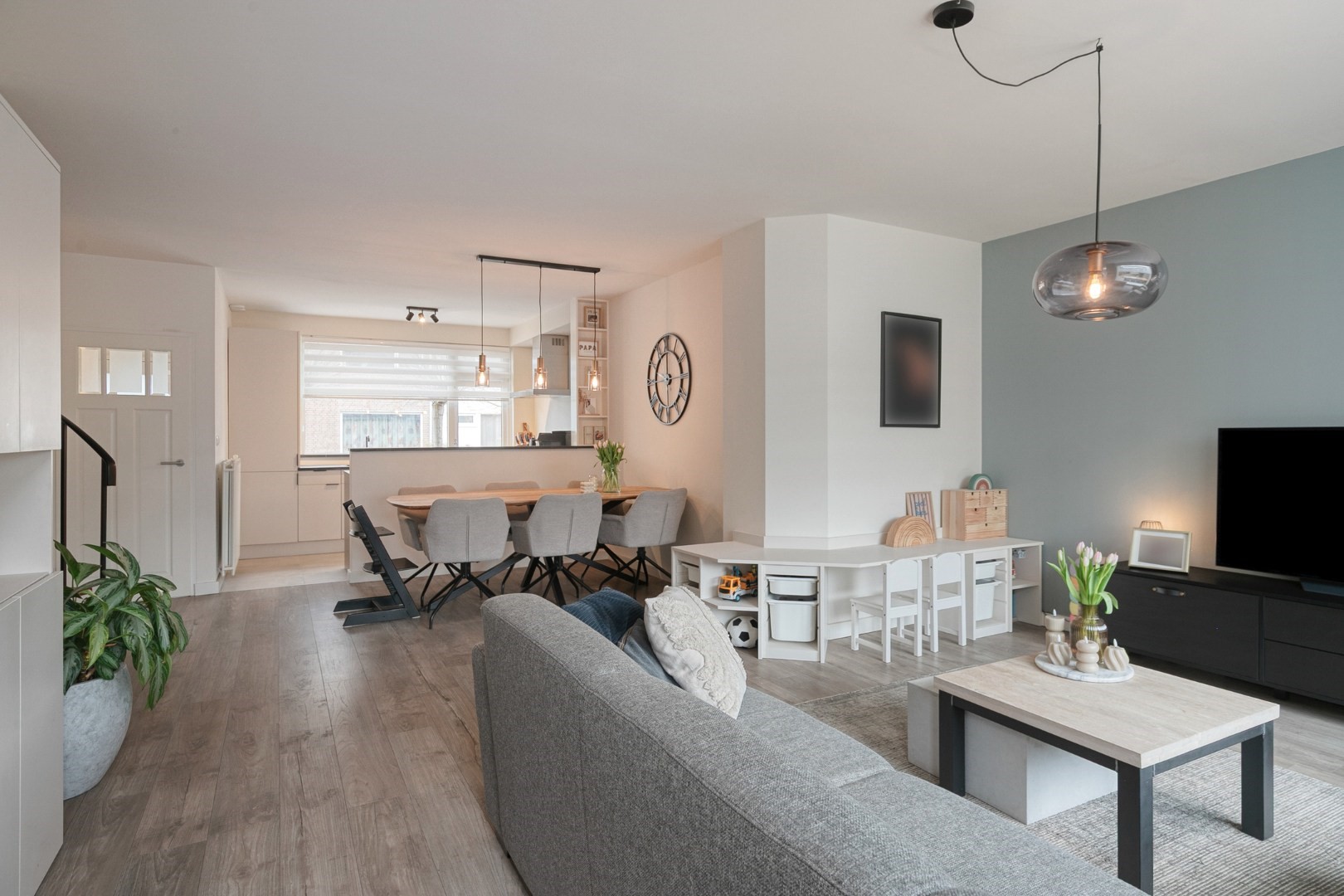Layout: spacious hall with new luxury front door, meter cupboard, and luxury toilet ('25), luxury door to a spacious Z-shaped living room of approx. 38m² with a garden door, spacious open kitchen with luxury kitchen fittings modernized in 2024 featuring an HPL worktop, hob with extractor hood, combination oven, dishwasher, refrigerator, freezer, large window, and plenty of cupboard space. Total living area approx. 45m² fitted with laminate flooring and stairs to the upper floor.