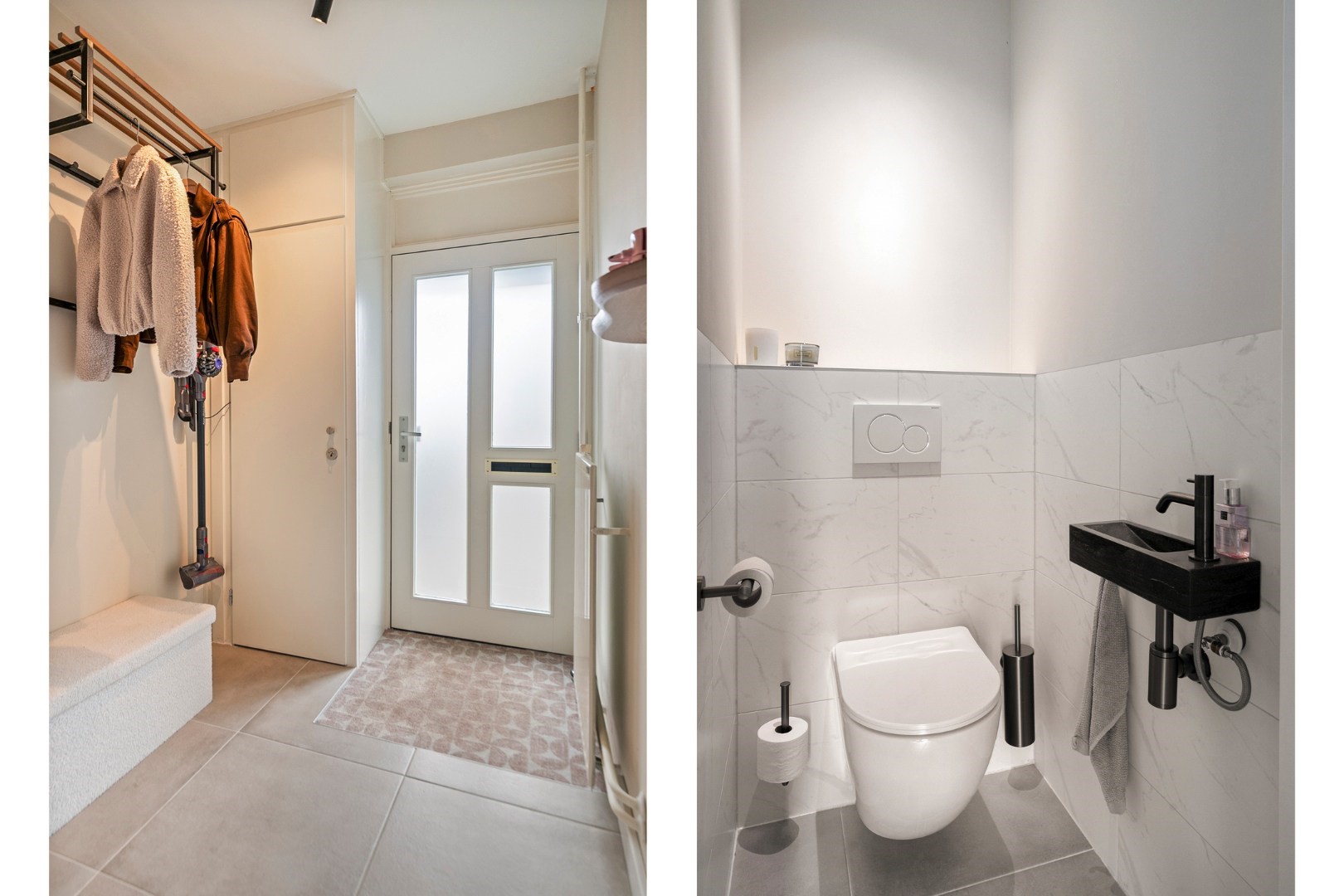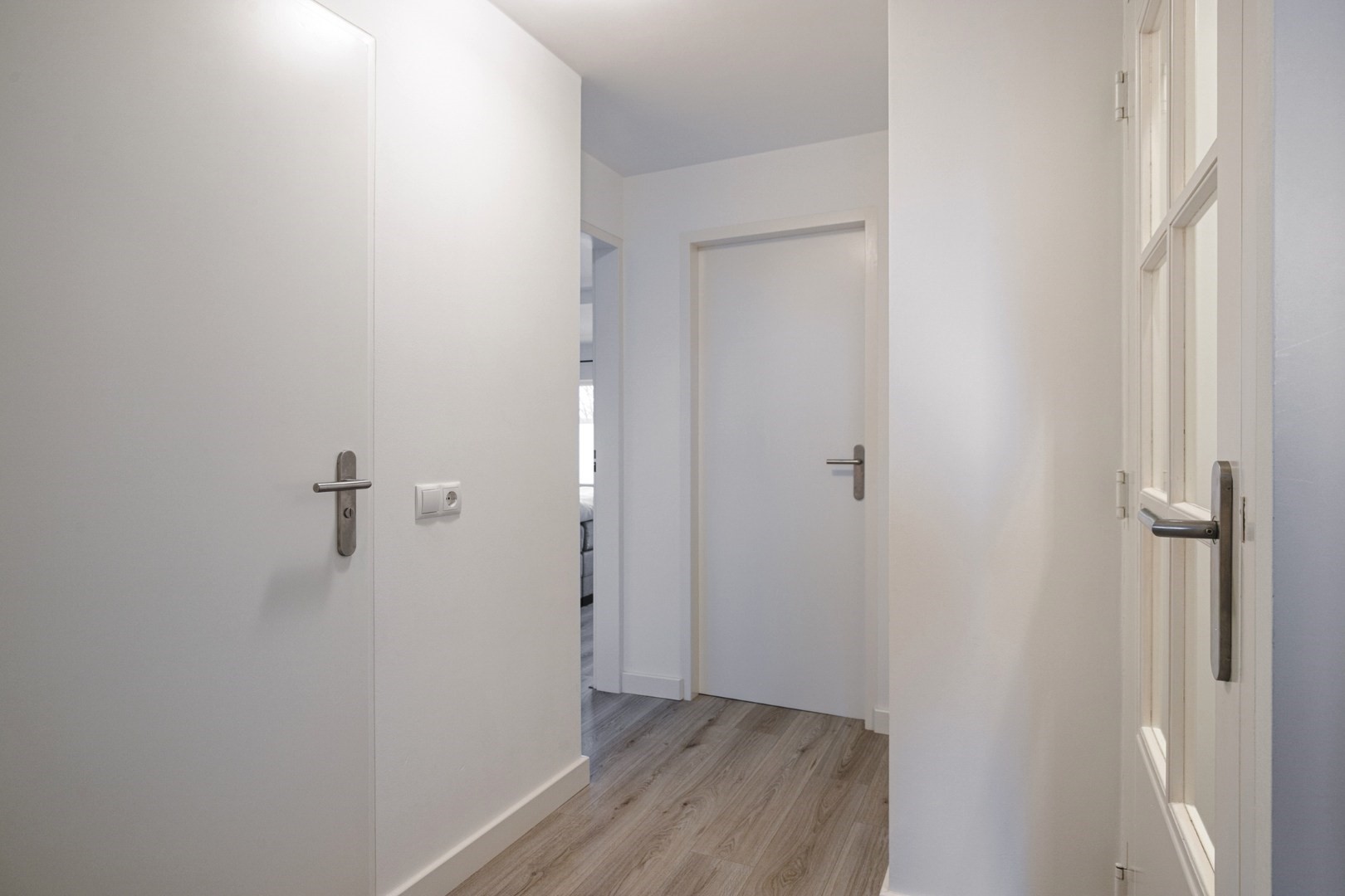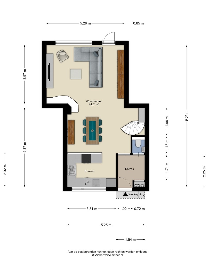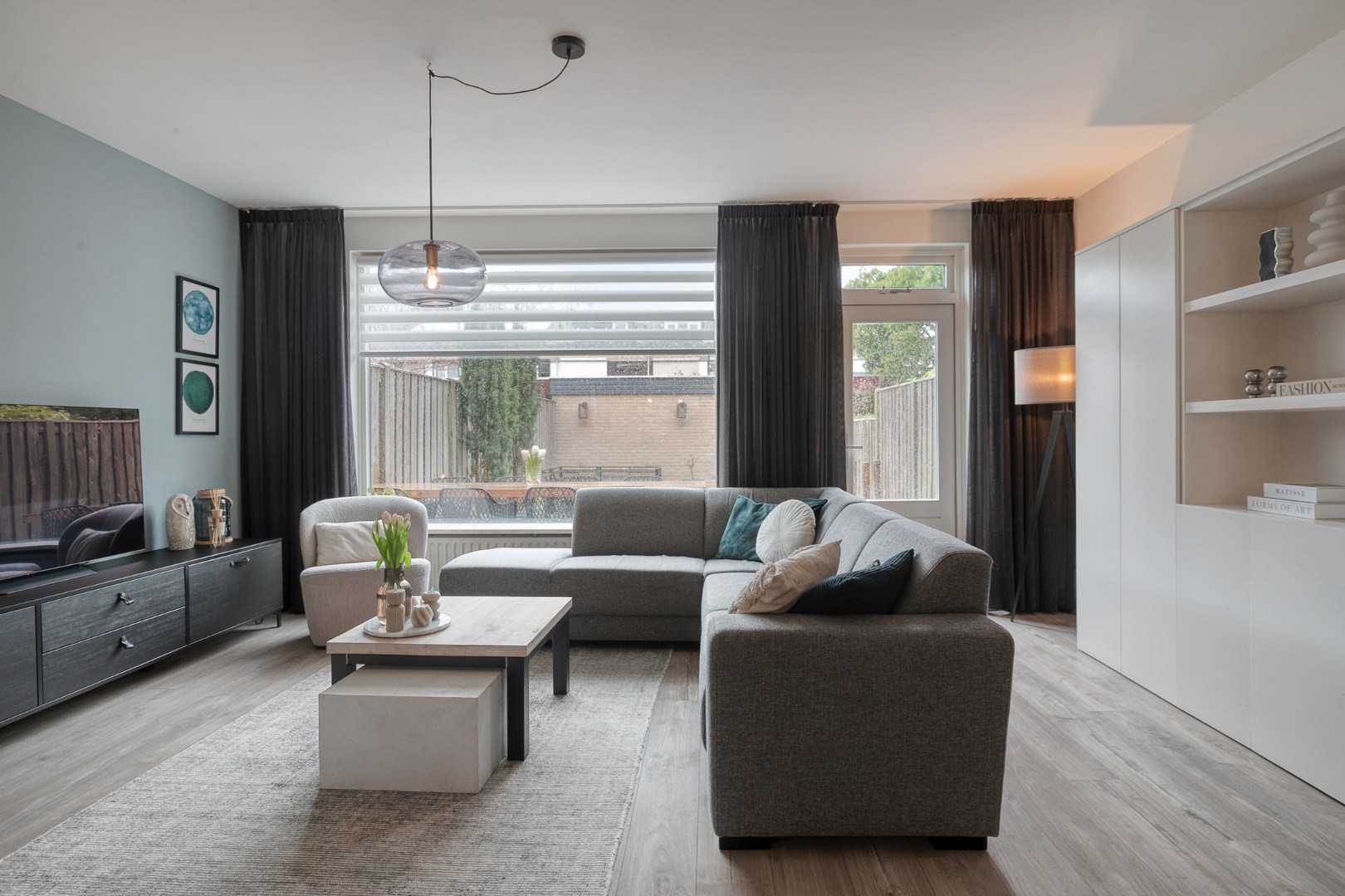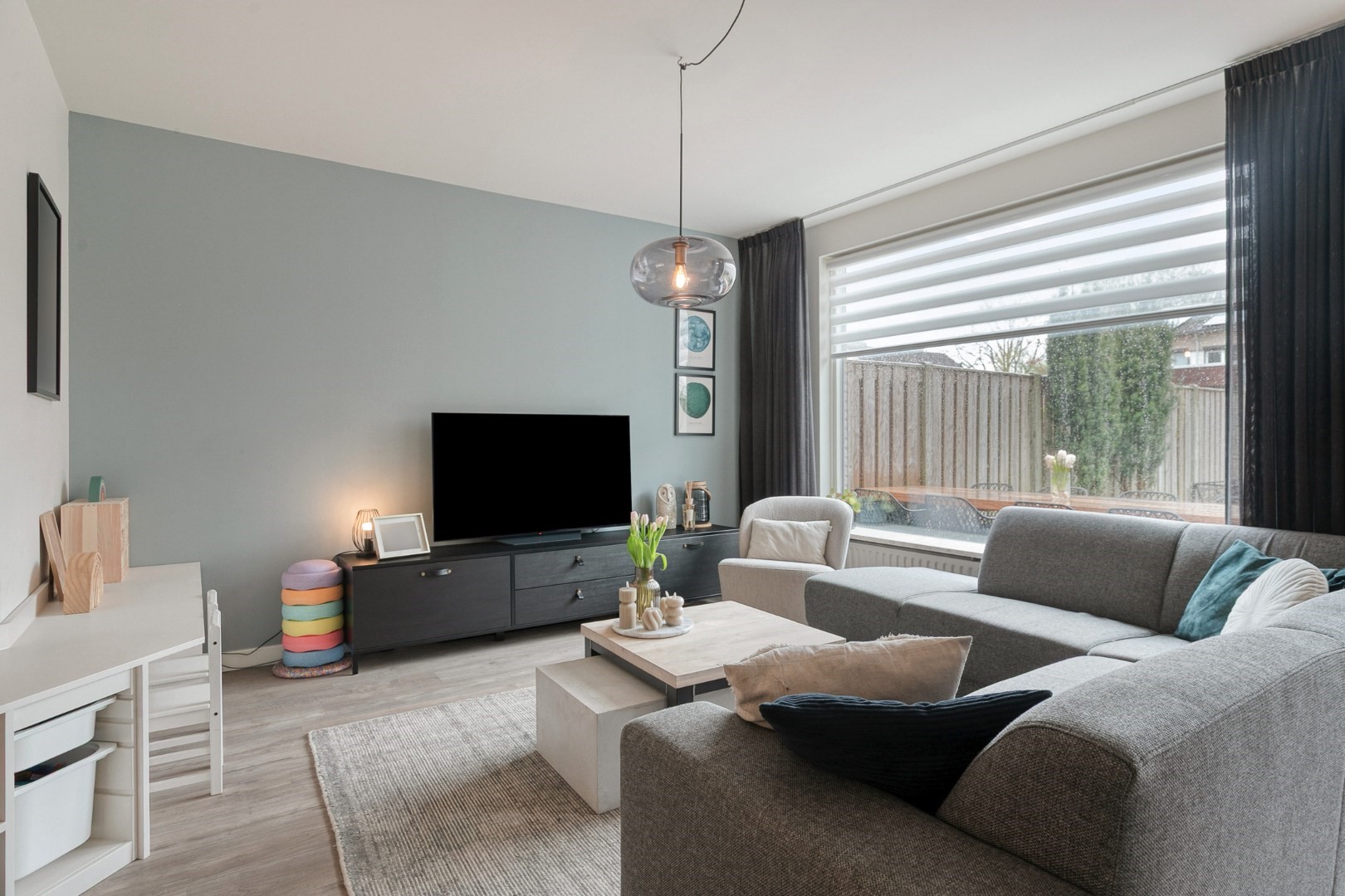 Layout: spacious hall with new luxury front door, meter cupboard, and luxury toilet ('25), luxury door to a spacious Z-shaped living room of approx. 38m² with a garden door, spacious open kitchen with luxury kitchen fittings modernized in 2024 featuring an HPL worktop, hob with extractor hood, combination oven, dishwasher, refrigerator, freezer, large window, and plenty of cupboard space. Total living area approx. 45m² fitted with laminate flooring and stairs to the upper floor.
