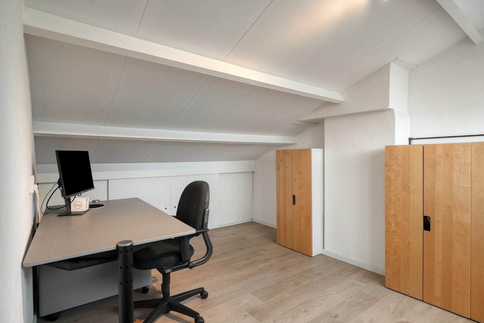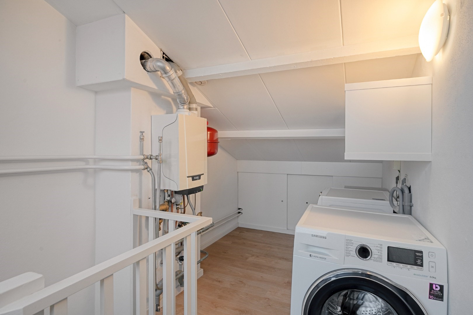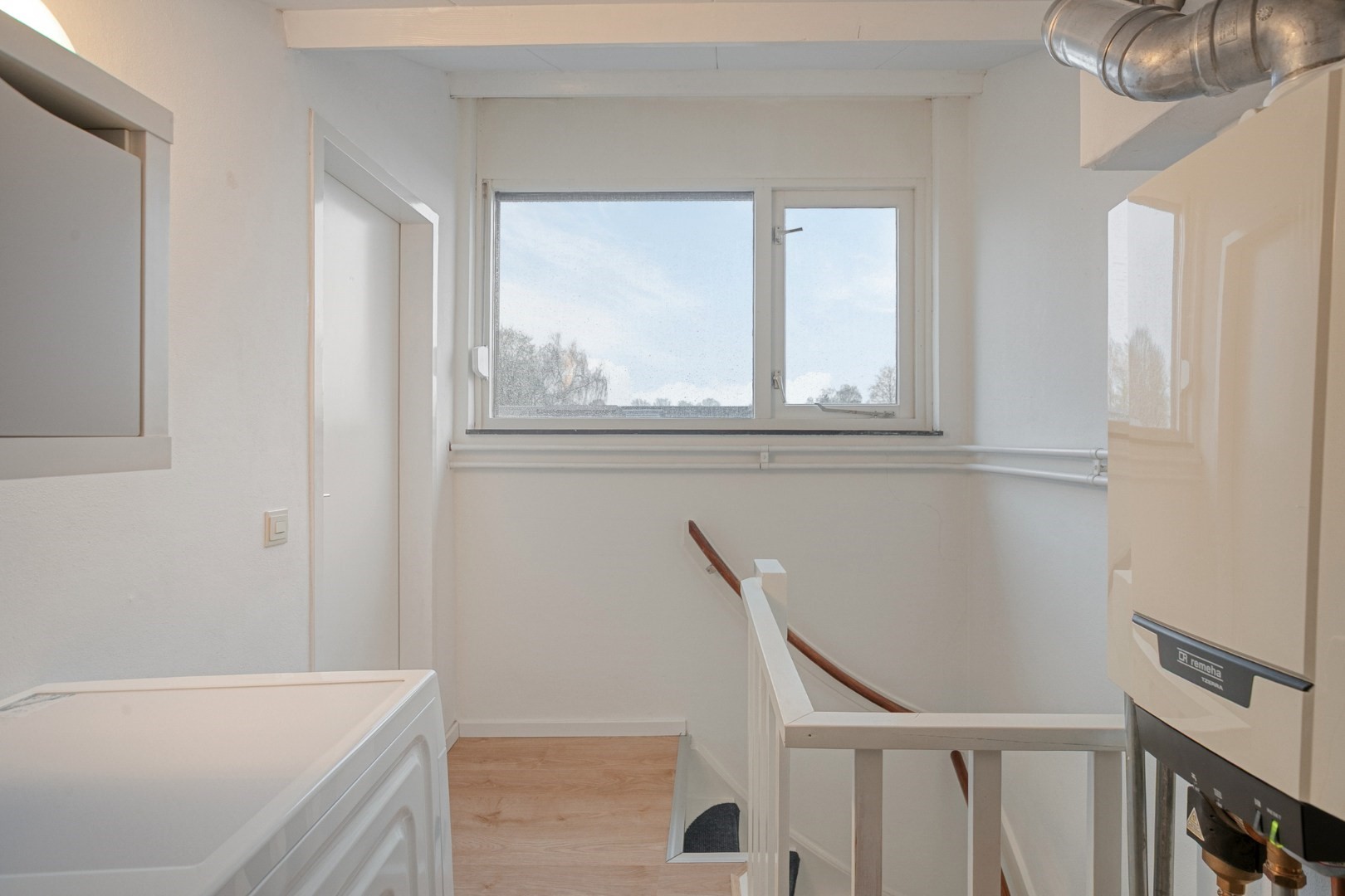 Fixed staircase to 2nd floor (with laminate flooring): landing with storage space, Remeha high-efficiency combi boiler ('15), wasmachine/dryer connection, surprisingly spacious 5th bedroom approx. 13m² with large windows and built-in storage space.