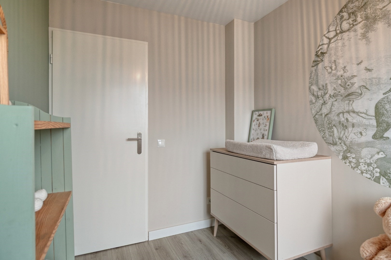 1e verdieping(v.v. laminaatvloer): overloop met bergkast, 4 slaapkamers resp. ca 13m² met hoog plafond, 10² en 7m² en 6m², mooie luxe badkamer(’21) met ligbad, aparte douche, 2e toilet en badmeubel.