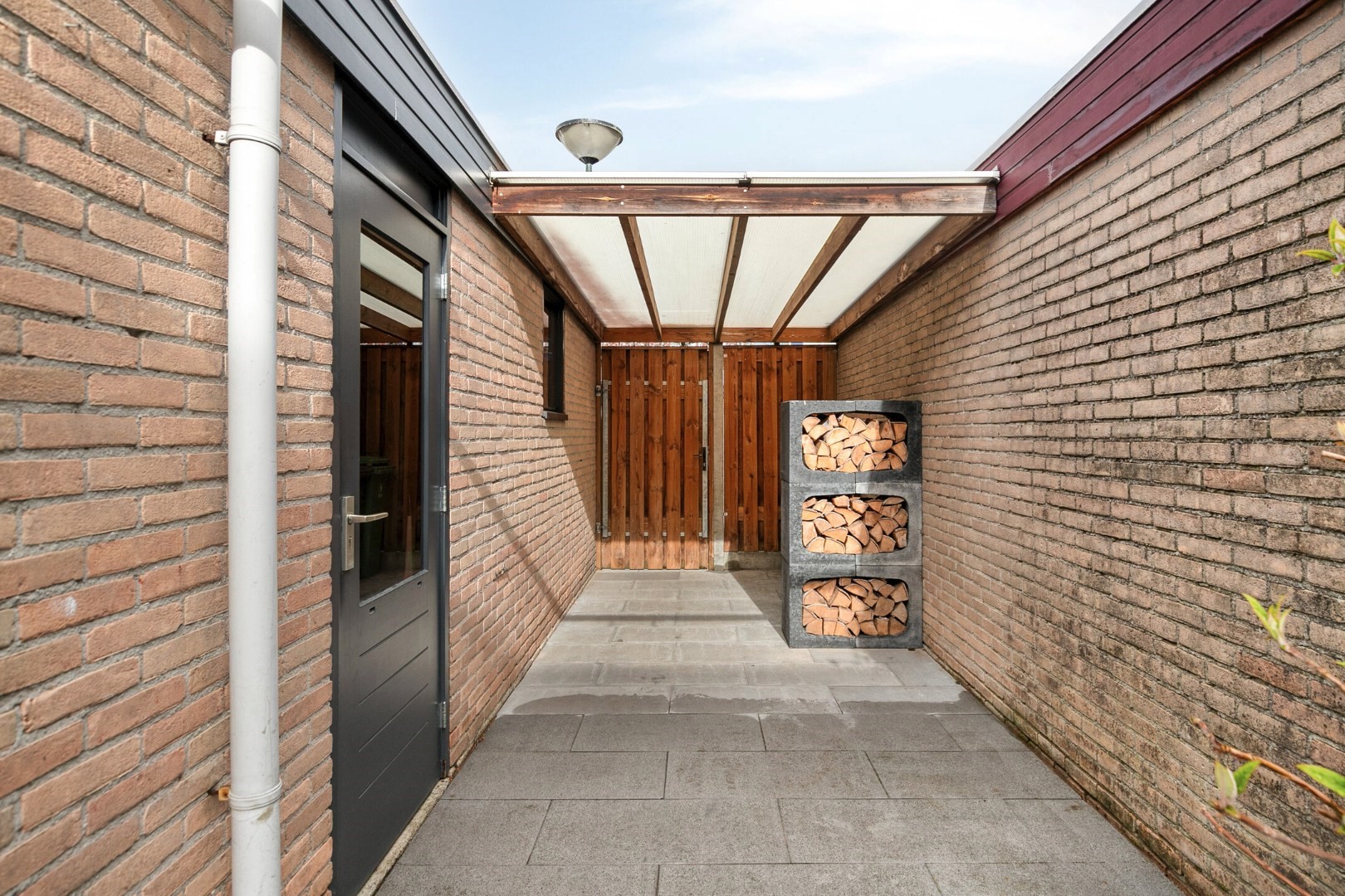Fraai aangelegde zonnige gedeeltelijk ca 15m diepe achtertuin(NW), met ruime garage met overkapping en poort met achterom aan rustig straatje met op de hoek speelplantsoen, basisschool en kinderdagverblijf.