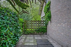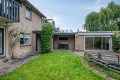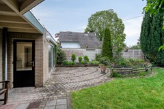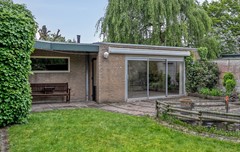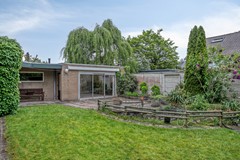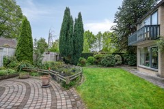 Fraai aangelegde royale ca 12m diepe en 20m brede zonnige achtertuin(NO) en ruim 5m brede zijtuin (mogelijkheid voor uitbouw), overkapping, garage met daarachter aangebouwde gastenverblijf/praktijk/kantoorruimte ca 25m2 met douche/toiletruimte met toilet en vaste wastafel en douche met badmeubel.