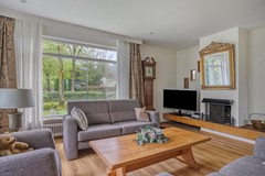 Indeling: entree met meterkast, luxe toilet en garderobe, ruime open kantoor/ werk/speelruimte ca 12m² met vide, leistenenvloer en trap naar verdieping, ruime lichte woonkamer ca 32m² met inbouwkast, open haard, zijraam en royaal uitzicht op boomrijke brede laan. Vanuit hal en open speel/werkruimte deur naar (eet)keuken ca 8m² met tegelvloer en complete keukeninrichting v.v. gas kookplaat, oven, afzuigkap en koelkast en raam met tuinzicht, deur naar kleine bijkeuken met bergkast, wastafel, kelderkast en tuindeur naar overkapping en garage en praktijk/kantoorruimte en royale zonnige fraaie achtertuin.