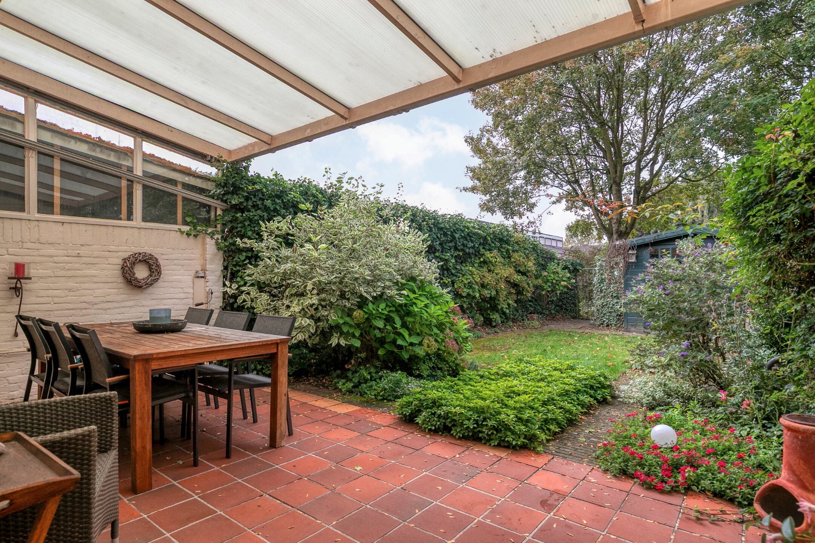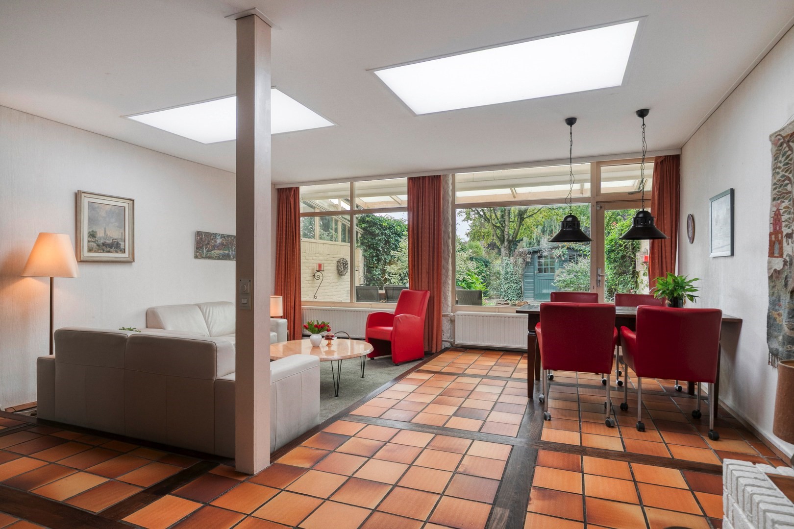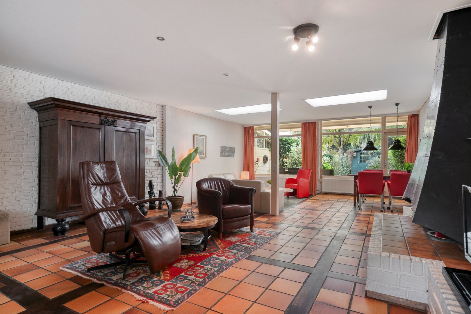 Totale living ca 60m² met originele tegelvloer en tuindeur naar royaal overdekt verandaterras ca 18m2 en zonnige ca 13m diepe achtertuin(grenzend aan royaal plantsoen) met tuinhuis en achterom.