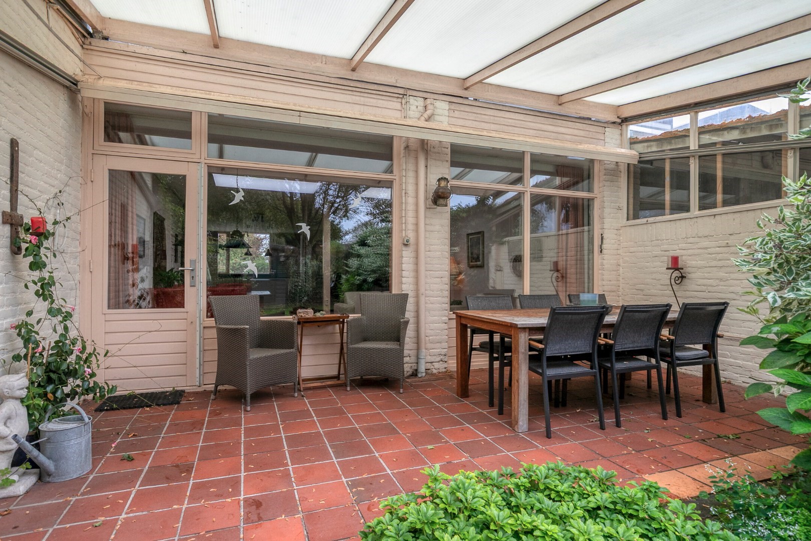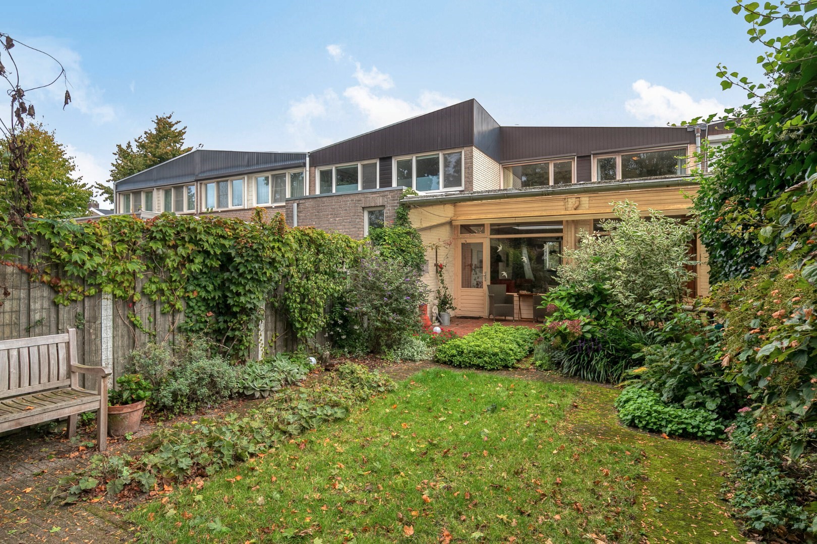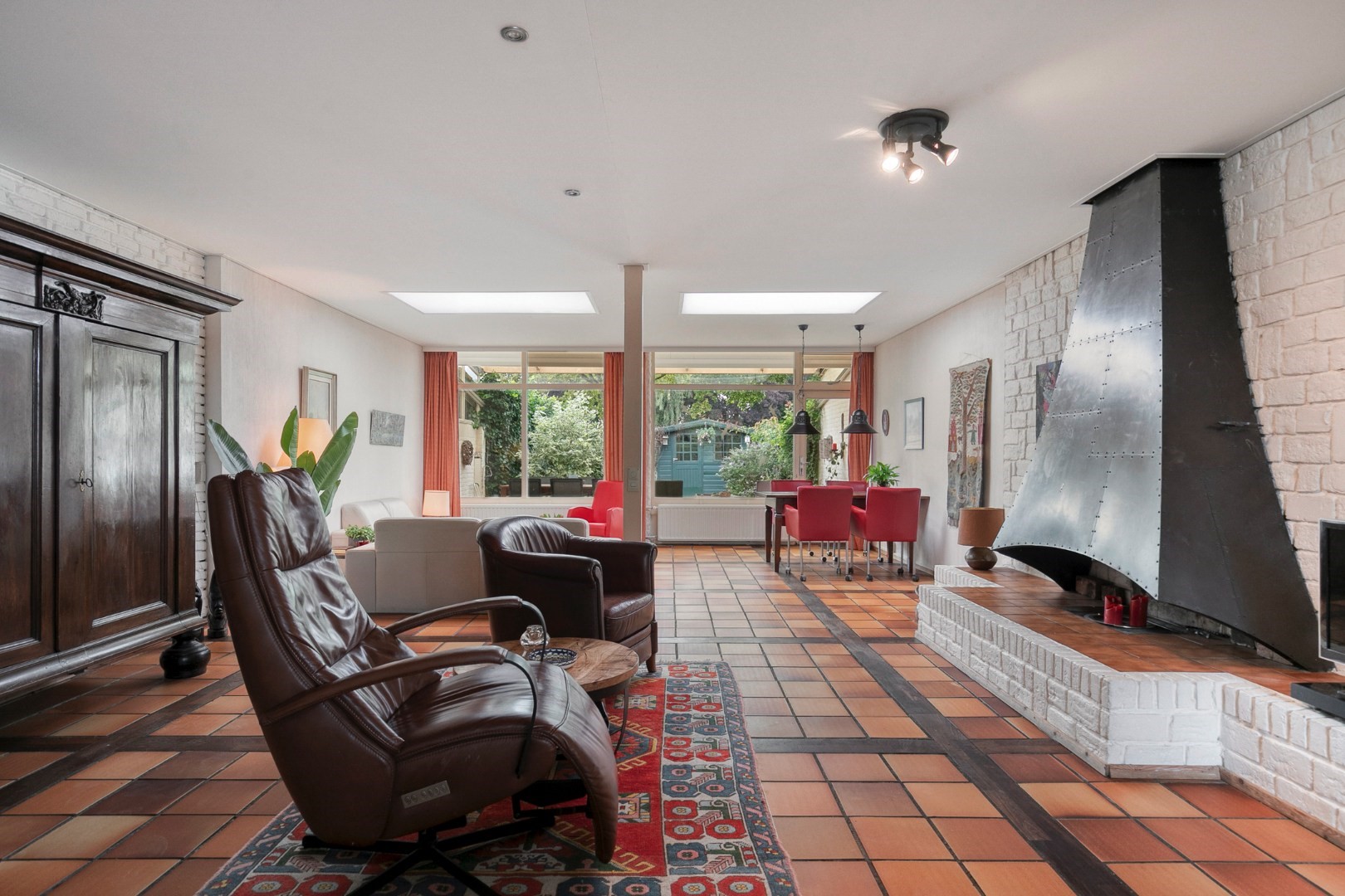 Totale living ca 60m² met originele tegelvloer en tuindeur naar royaal overdekt verandaterras ca 18m2 en zonnige ca 13m diepe achtertuin(grenzend aan royaal plantsoen) met tuinhuis en achterom.