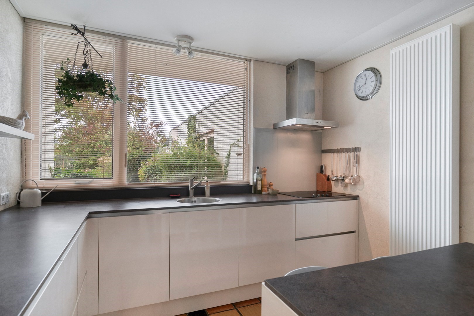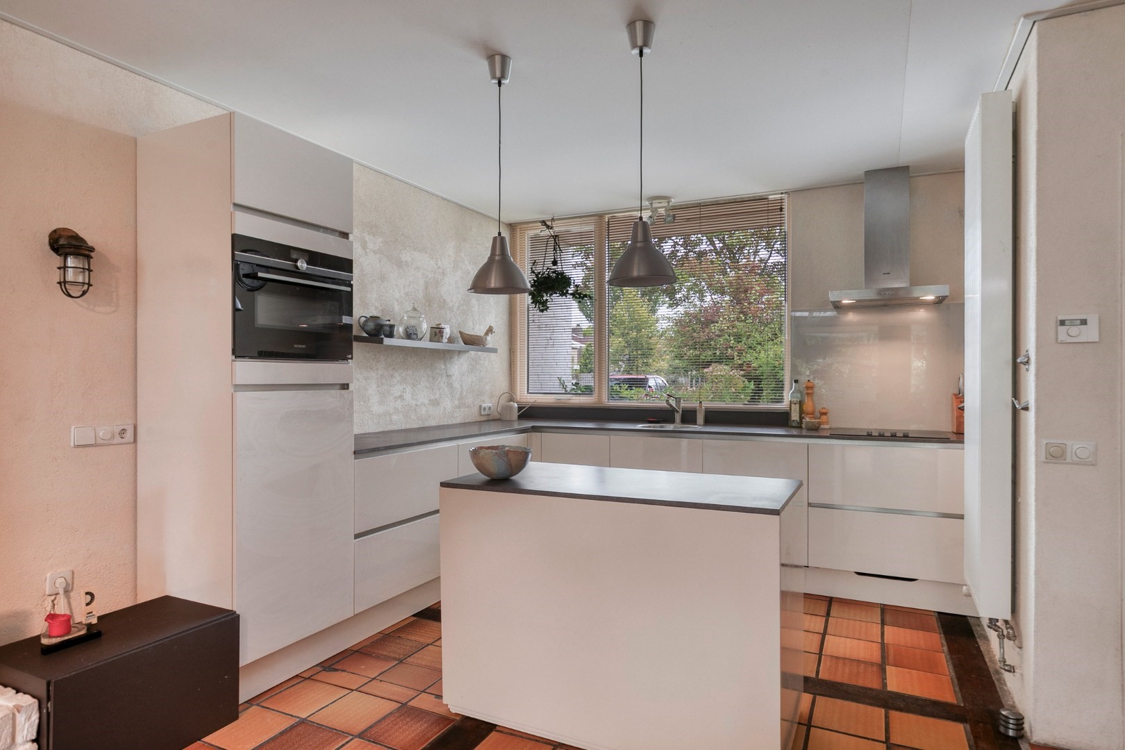 Woonkamer in open verbinding met open keuken met luxe lichte keukeninrichting (ca '20) v.v. kookplaat, vaatwasser, combi-magnetron, koelkast en afzuigkap en zicht op voorzijde.