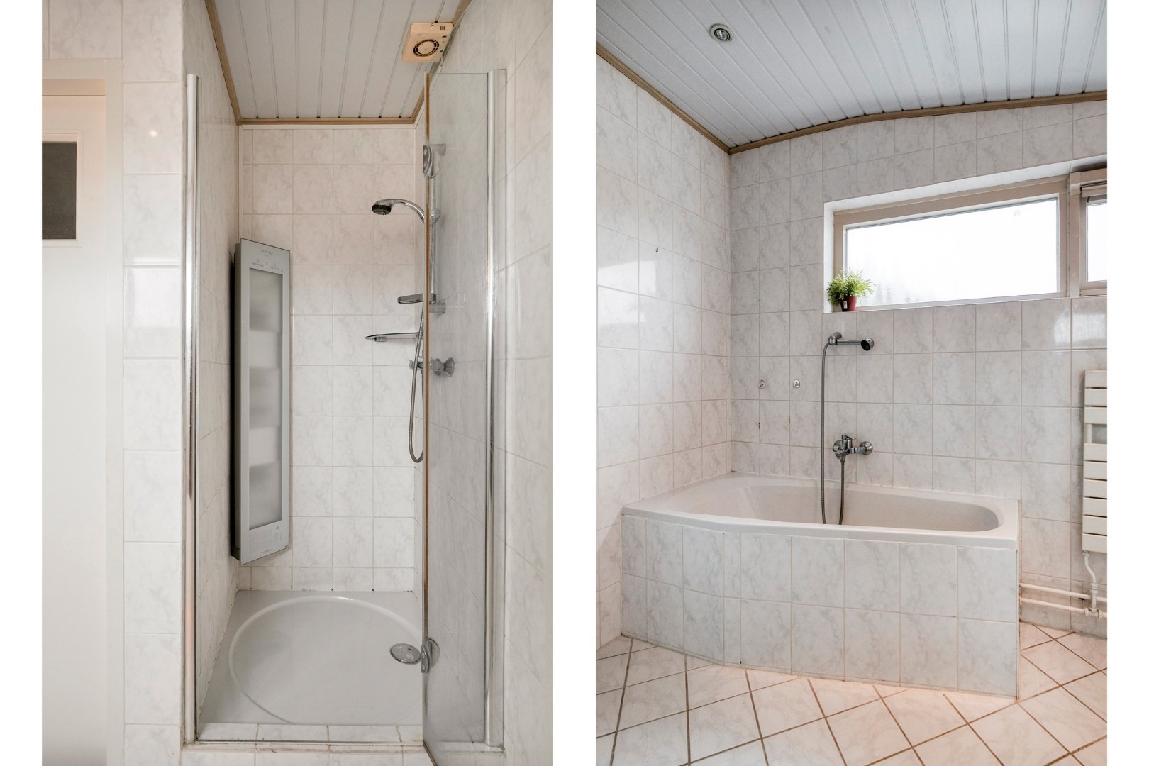 1e verdieping: overloop, 3 ruime slaapkamers resp. 13, 12 en 9m2 (2 met zolderbergingen), lichte badkamer (’02) met ligbad, aparte douche, 2e toilet, designradiator en vaste wastafel.
