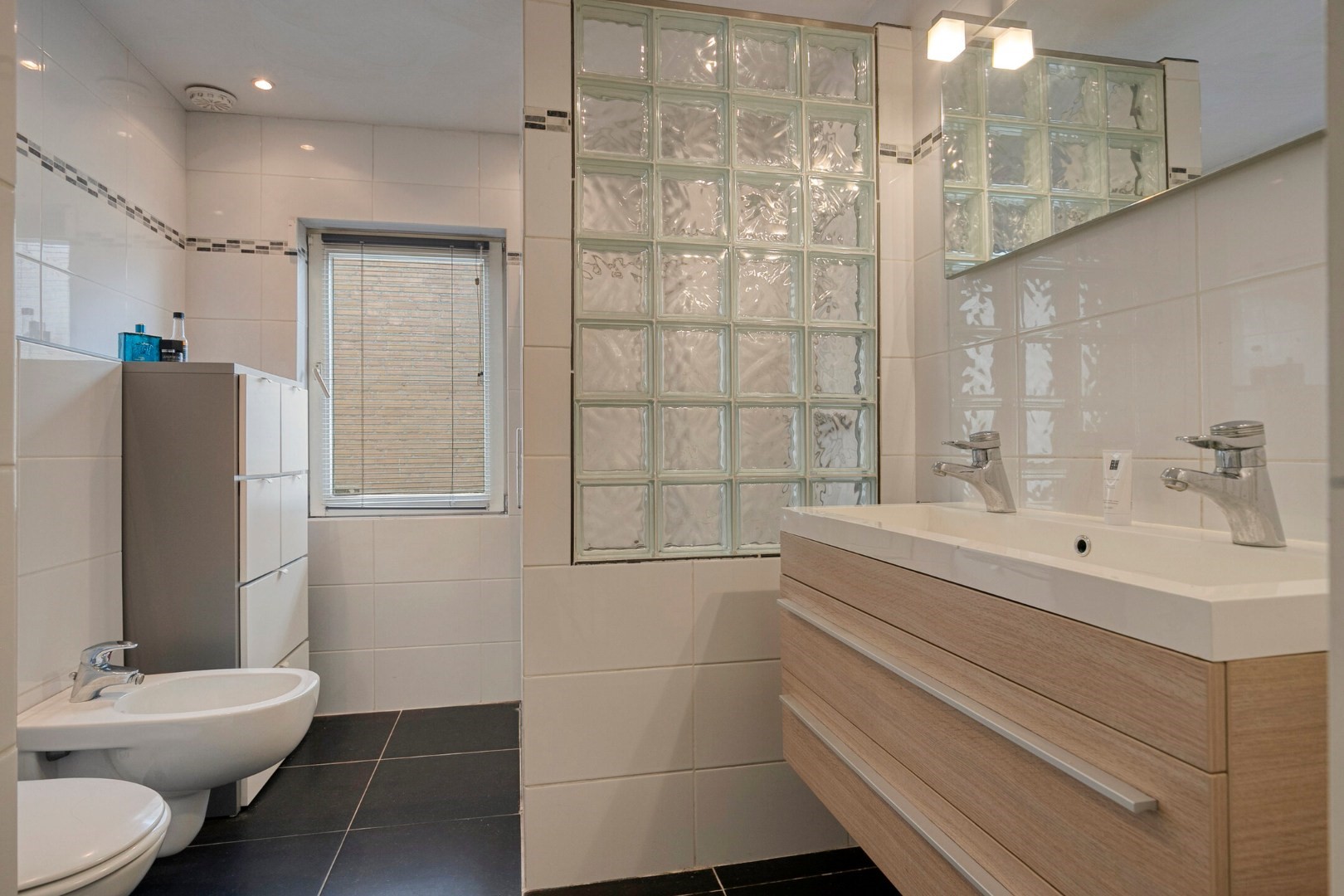 1e verdieping (v.v. laminaatvloer): royale overloop met vide, 3 slaapkamers resp. ca 21m² met royale kastenwand, ca 9m² met mogelijkheid verhoogd slaapgedeelte (entresol) en ca 8m², ruime luxe badkamer (’15) met ruime inloopdouche, luxe 2e toilet, bidet, luxe breed badmeubel met brede wastafel, 2 kranen en zijraam.