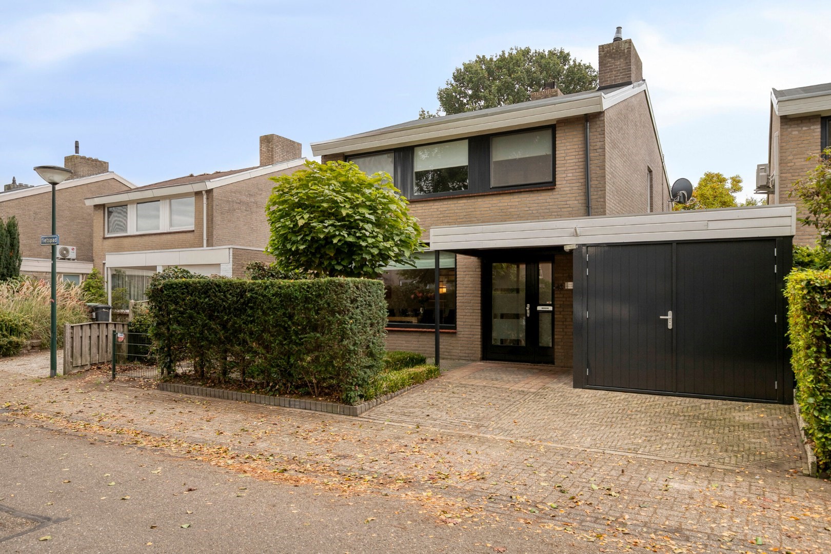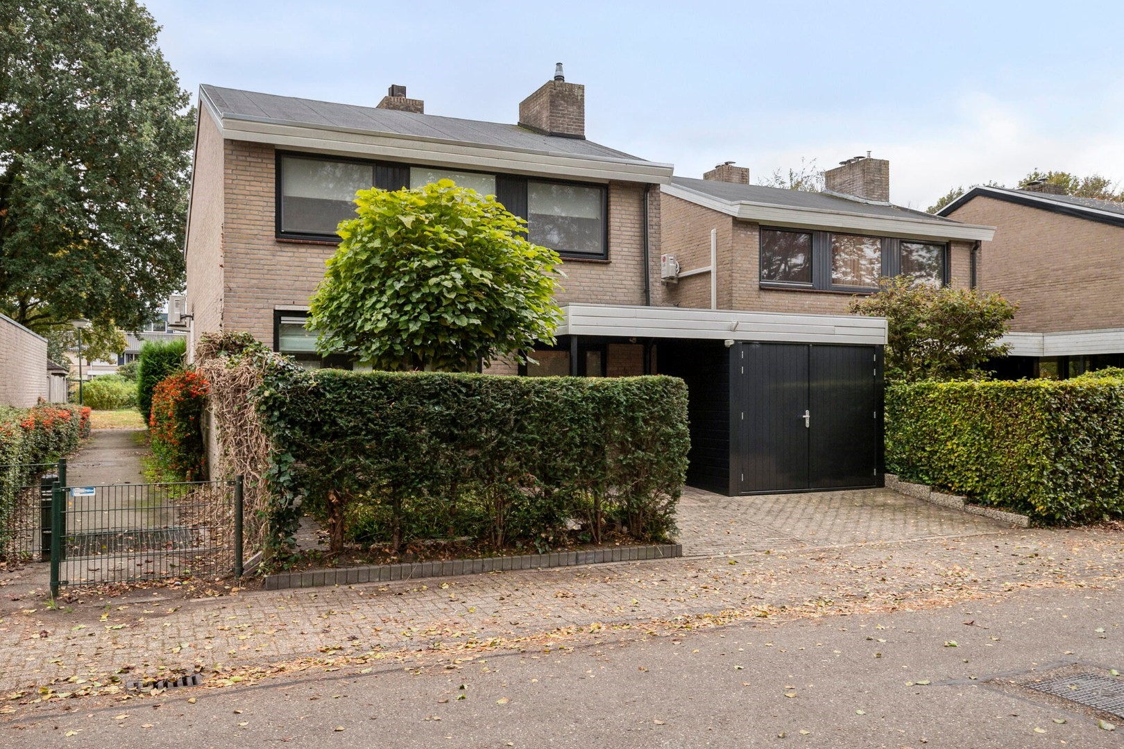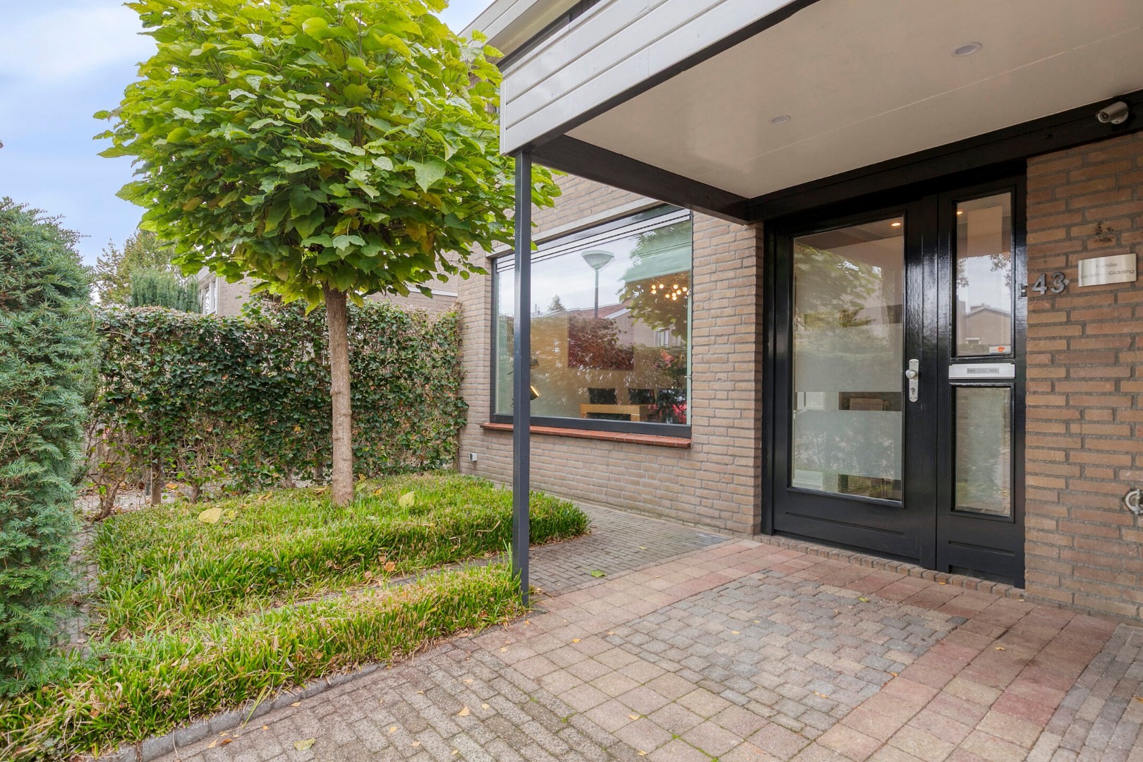 Fraai aangelegde voortuin met oprit.
