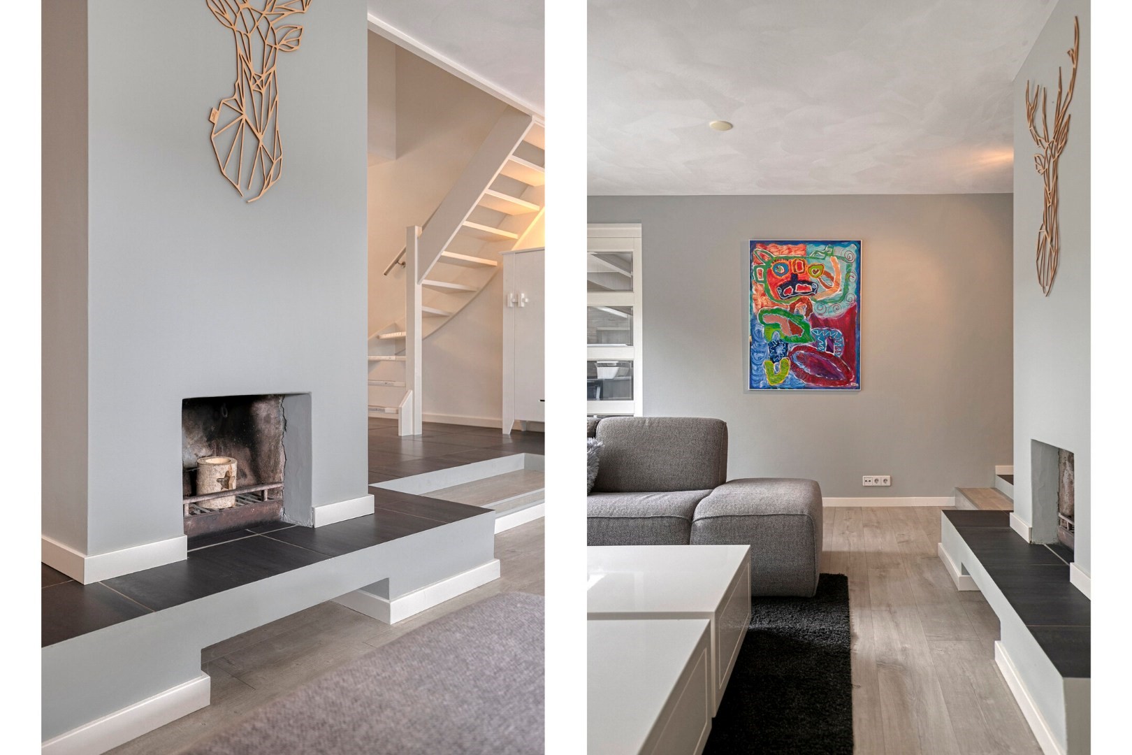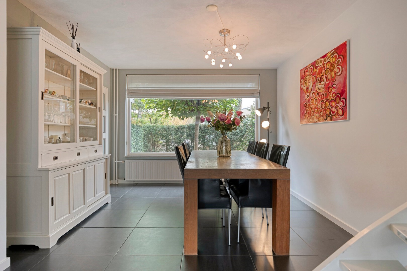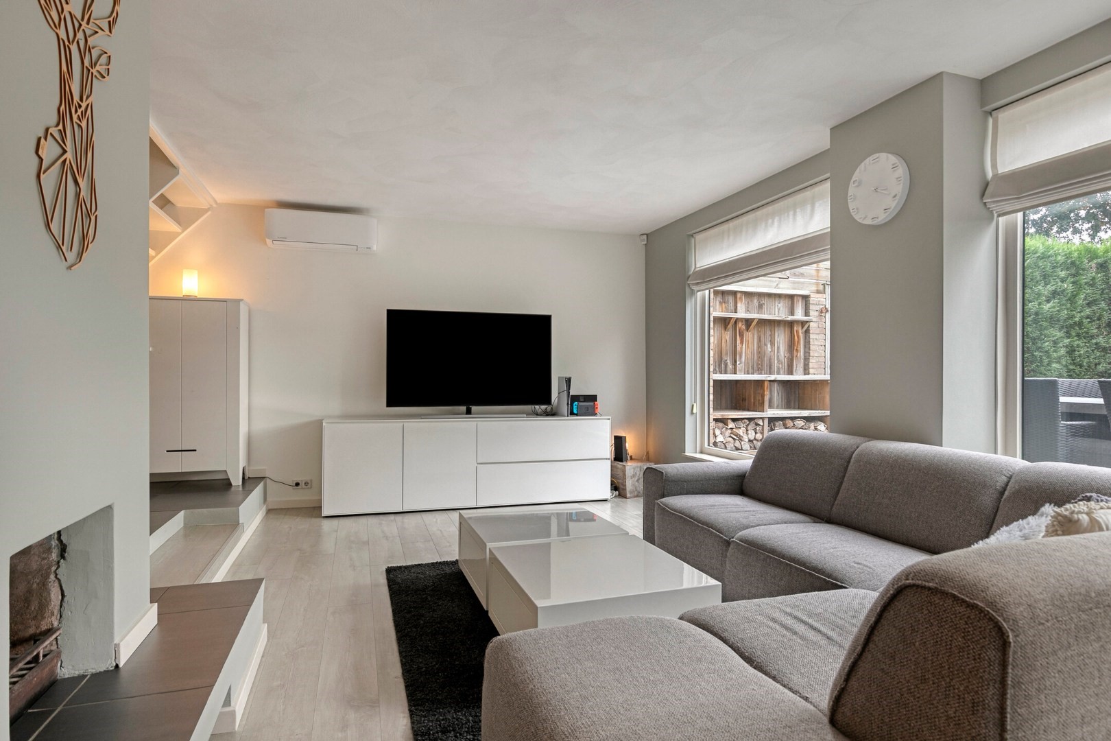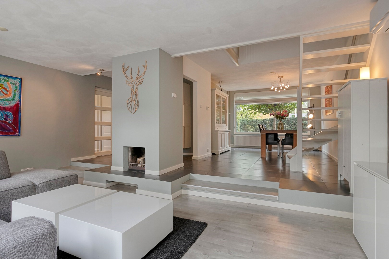Indeling: royale lichte hal met luxe toilet, was/cv-berging met Remeha HR cv-combiketel (’12) met aansluiting wasapparatuur, grote speels ingedeelde woon/eetkamer (ca 50m²) verdeeld in royaal eetgedeelte aan de voorzijde, lichte verlaagd woon/zitgedeelte met airco, open haard en grote ramen in open verbinding met werk/studie/speelhoek(voorheen keuken), schuifdeur naar royale en lichte keuken (ca 10m2) met fraai lichtinval van verhoogd dak met ramen en luxe moderne keukeninrichting(’17) v.v. 5-pits kookplaat met brede afzuigkap, oven, koelkast, vaatwasser en granietenblad, deur naar vergrote garage/berging ca 15m2.