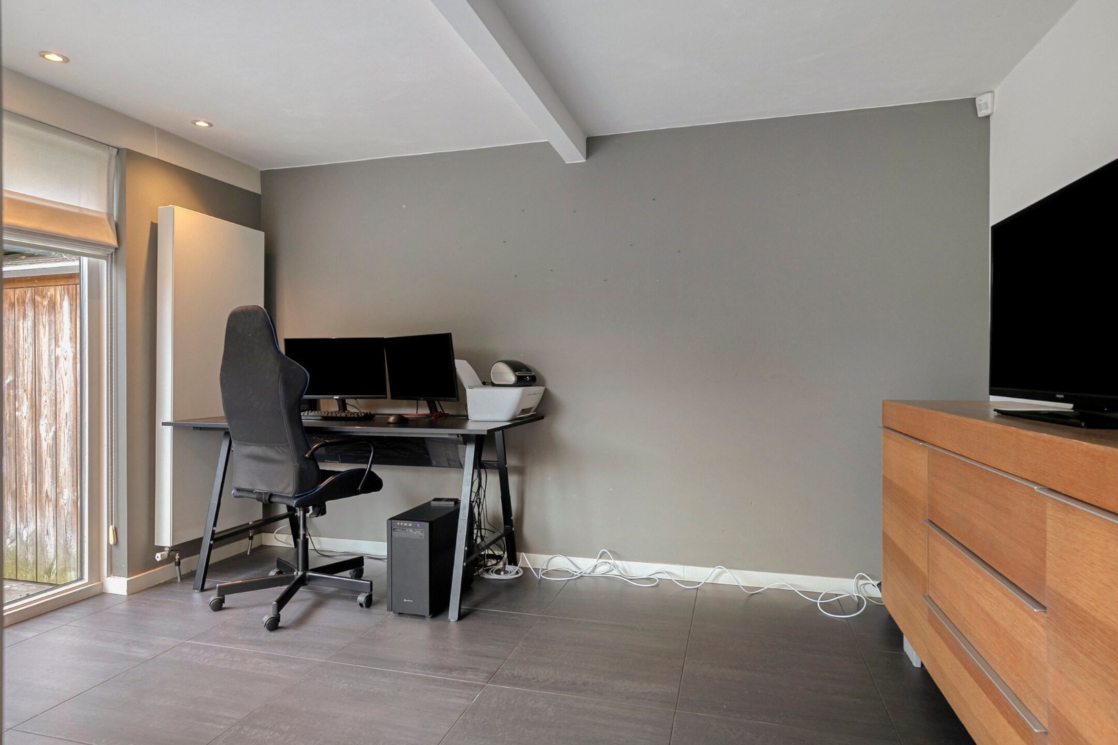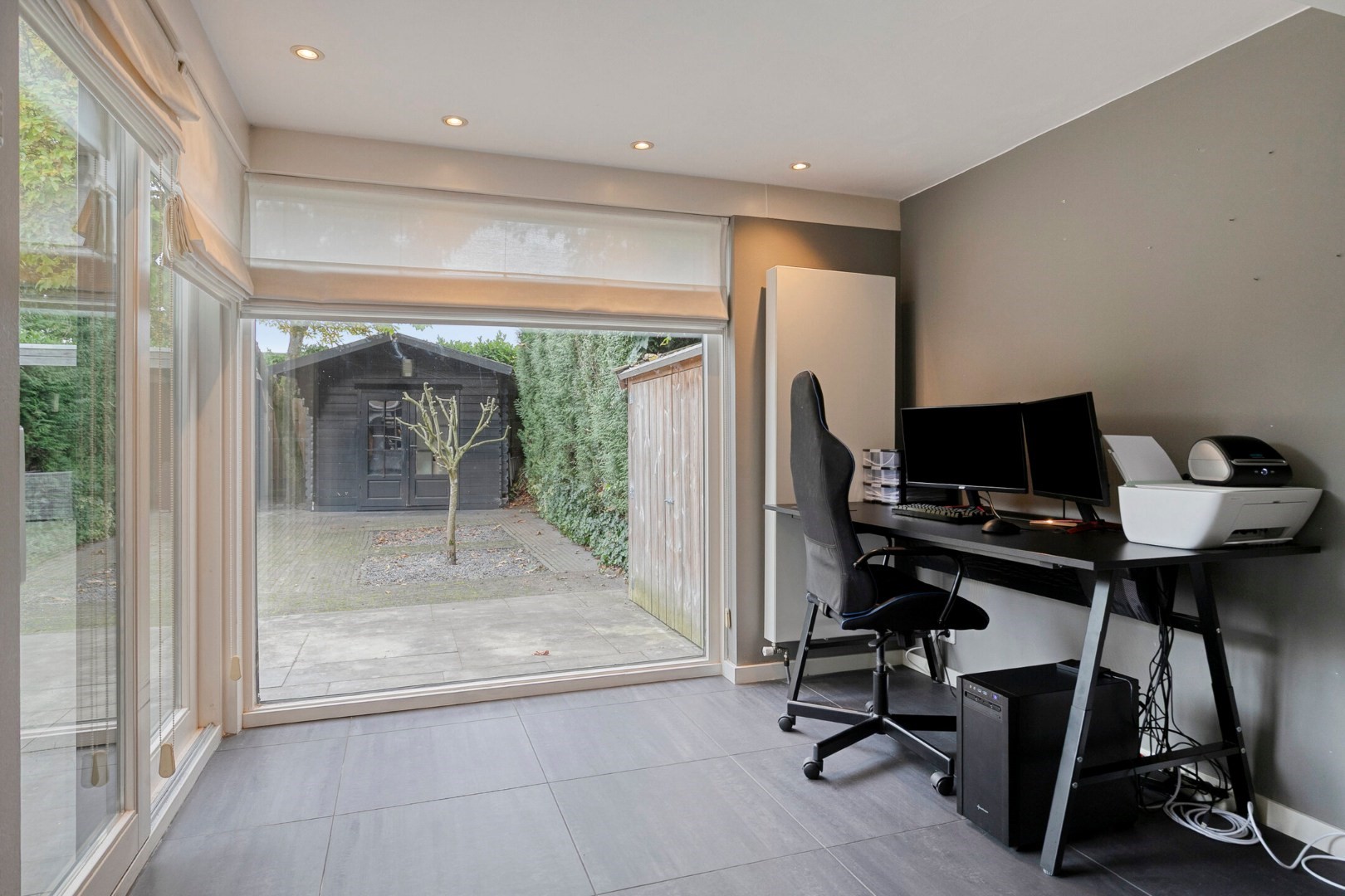 Vanuit woonkamer toegang tot aparte lichte tuin/speel/werkkamer ca 10m2 met schuifpui naar terras.
